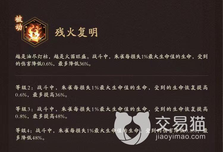 最后一个则是觉醒矢志不渝,当使用这个技能的话,在争斗过程中,如果朱雀要是被敌方给击杀掉了之后,就会立刻变身成为一团火焰,对目标敌人进行攻击,而且给敌方造成的伤害还不小,这个效果将会一直持续到三个回合结束。