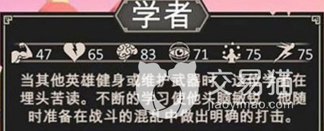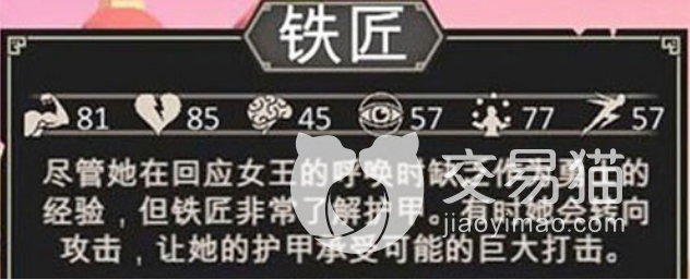第四个技能就是铁匠。铁匠这个角色是在力量值上面最突出,而且他的初始天赋也比较高,对于新手来说,他的三种数值都还不错,天赋也是比较稳定的,使用的武器有两个,一个是单手锤,一个是盾牌,也就是说可以单独输出的同时自己也有一定的防御能力,所以战斗的时候可以两个定位相互转换。