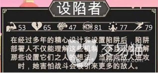 第六个为大家介绍设陷者,设陷者它的敏捷度非常的高,建议大家使用射线者是要提前做准备,在他的属性上面,最常使用的是解除高级陷阱的技能,而最让大家惊艳的是还是反击的技能,一般会利用标枪和圆盾来进行输出和防御。