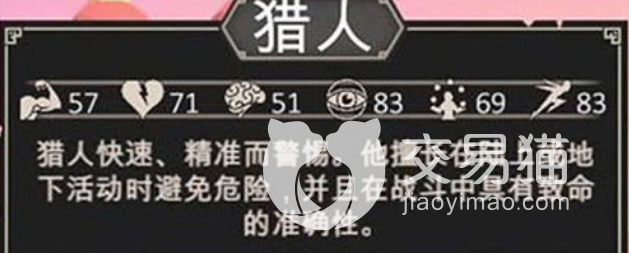 首先第一个为大家介绍的是猎人这个角色。这个角色因为是在速度属性上比较高的,一般新手玩家体验的时候,对于洞察值、速度值都比较看重,它的天赋是高级潜行,可以在单独行动的时候避免大部分的战斗,第二个技能可以帮助避开前路中设置的很多陷阱,第三个技能就是一个带了输出的技能,可以在能量爆发的时候触发一定的伤害,第四个技能一般就是大招,是在猎人使用弓箭的时候触发一个完美攻击,也是目前猎人伤害最大的一个技能,一般猎人使用的武器是弓箭带来远程攻击。