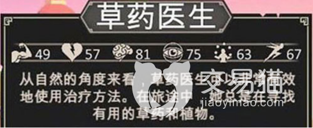 第七个就是辅助型角色草药医生,他的智力也是比较高的,在游戏中 职业里面它的属性是具有功能性的,可以给团队带来治疗,一次可以恢复超三人的生命值,而且第二个天赋是可以在探索的时候获取更多的植物,为草药师准备武器的话,大家去看看法杖,不要选择魔法书。