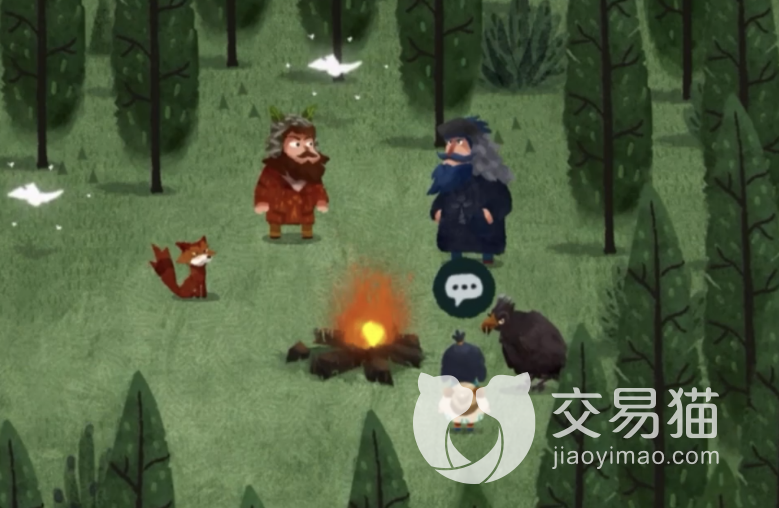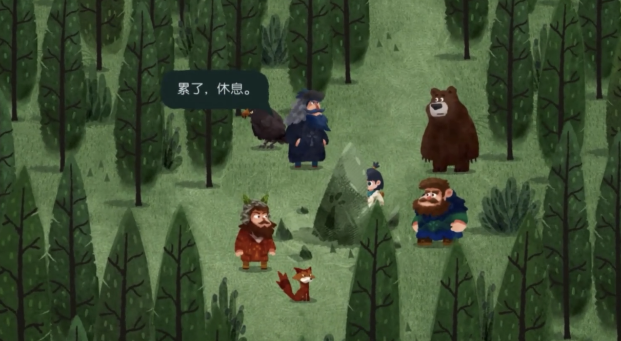 随后来到火堆旁边,能够看到一只狐狸和一头熊,够获得第二块和第三块地图碎片,拼接之后就会有布条指引正确的方向;