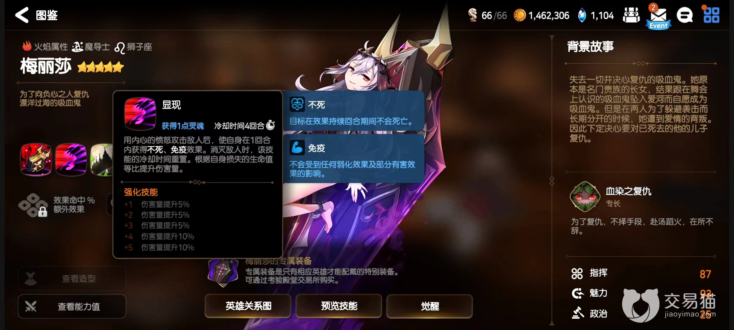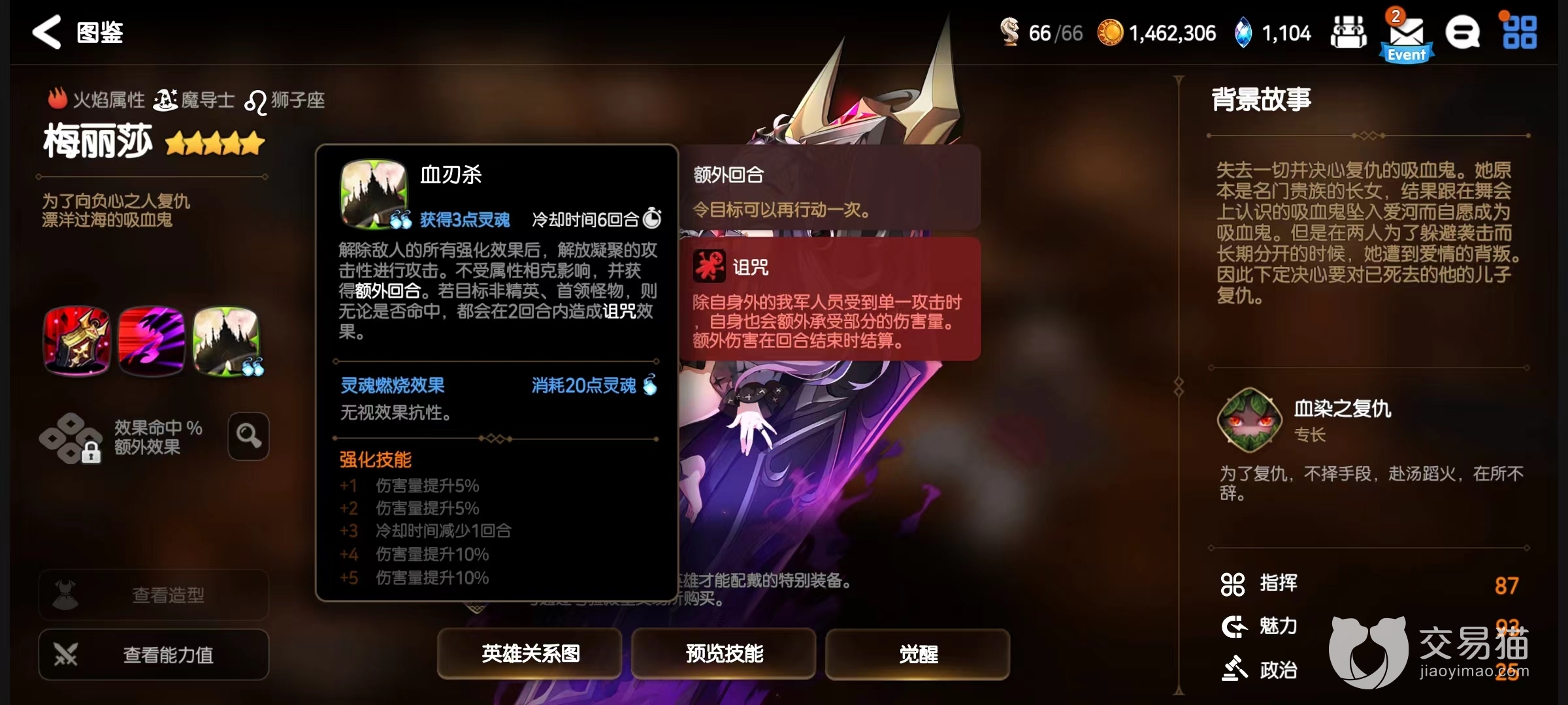 第2个技能显现,在攻击敌人后,自身将在一回合内获得不死和免疫这两大效果。不死作用是在持续回合期间即使受到致命攻击也不会死亡,免疫是能使角色不受任何弱化效果以及部分有害效果影响,有了这两大状态,就可以在回合内放心输出。同时消灭敌人时还会将该技能冷却时间重置,自身血量越低伤害越高。第3个技能血刃杀,解除敌人所有强化效果同时进行打击,不受属性克制影响,自身获得额外回合。如果攻击目标是非精英首领怪物,则无论此技能是否命中,都会对目标造成诅咒效果。该技能还有灵魂燃烧效果,能无视对方效果抗性,命中率大幅提升。