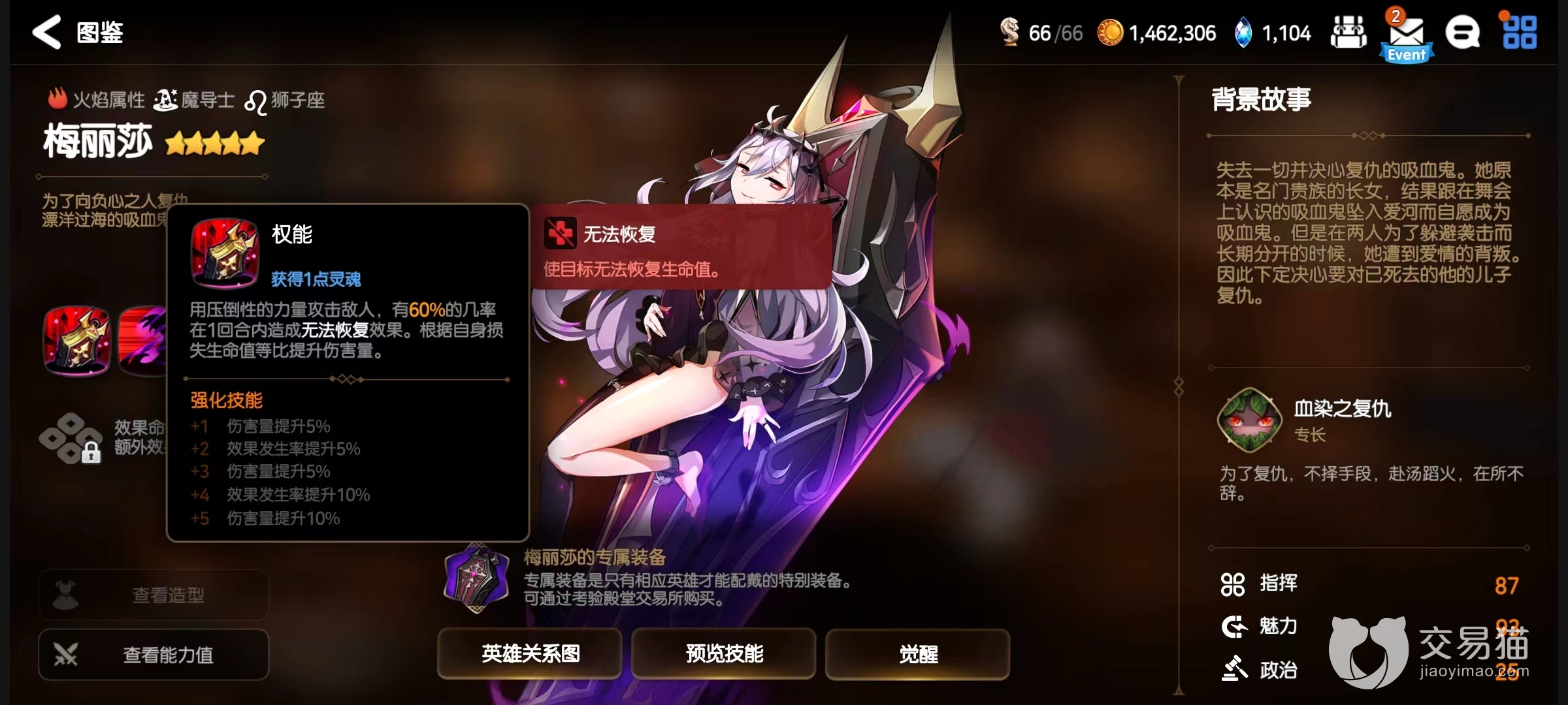 第1个技能权能,利用压倒性力量攻击敌人,有百分之六十几率使其在一回合内无法进行恢复,同时根据自身已经损失生命值提升伤害量。简单来说就是伤害加禁疗,并且自身当前血量越低,伤害也就越高。禁疗在现在战斗中作用非常关键,很多角色都拥有自己回血以及为队友加血技能,该角色就能很好克制这些。同时在强化技能之后伤害量和触发几率都会大幅提升。
