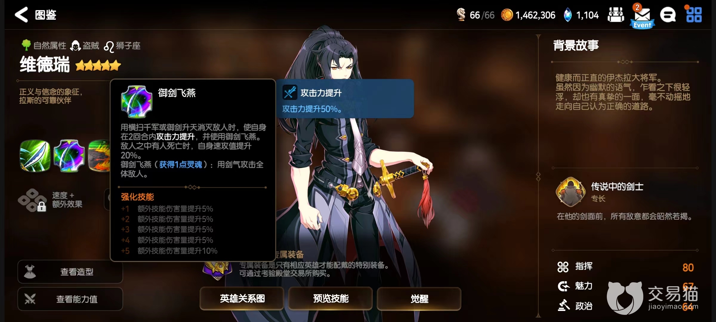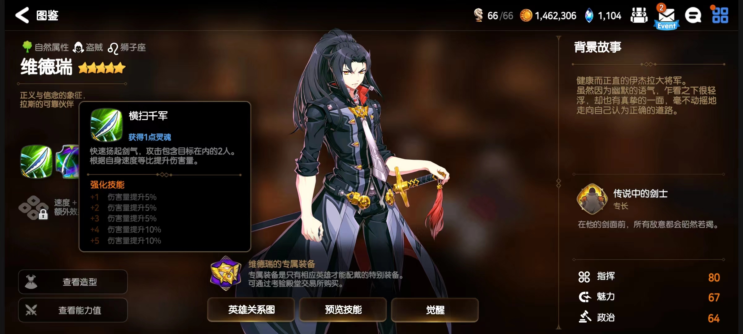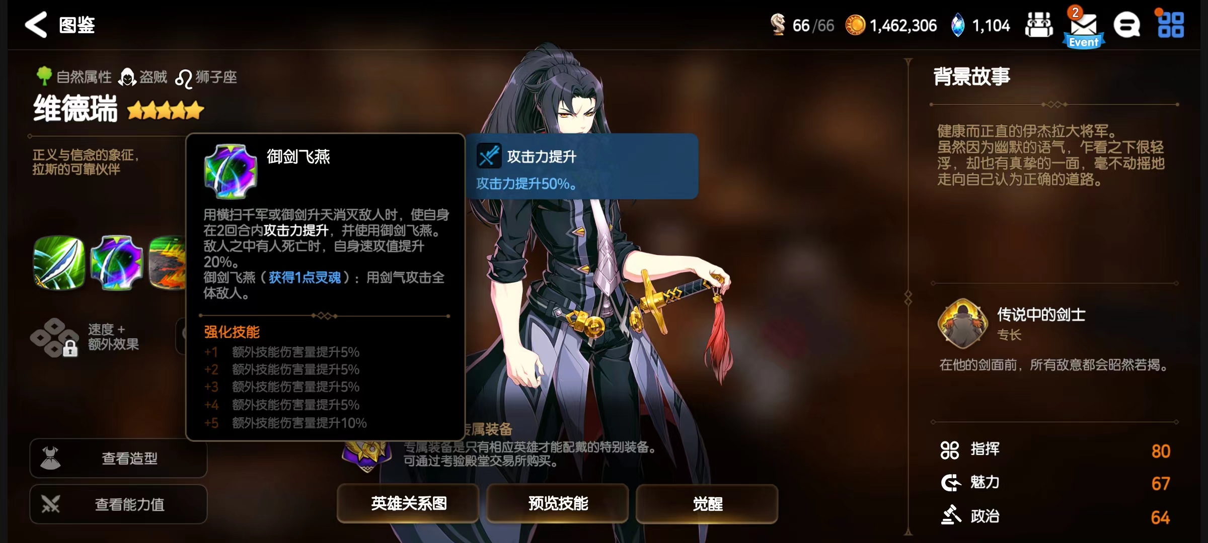 该角色是一名拥有自己专属装备的类型,这就使得部分技能能获得装备所带来的强化效果进一步提升,第1个技能横扫千军,快速释放剑气攻击对方两名目标,强化技能后伤害量大幅提升。没有其他效果,也不受到专属装备加成,属于中规中矩的普通伤害。第2个技能御剑飞燕,当使用横扫千军或是御剑升天消灭敌人时,自身将获得两个回合的攻击力提升效果,提升比例为50%。此时可以释放御剑飞燕,如果敌人中有人阵亡,自身速攻值提升20%。