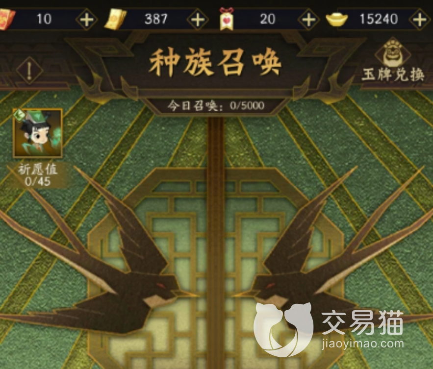 另外一种方式就是种族召唤,之前提到过伏羲英雄的抽取也是通过这种召唤,不过种族召唤的话是有次数限制的,一个星期期间玩家只能使用五折的元宝去购买十张卡券,数量用完了之后这个星期就不可以再进行使用了,相比上一种方式还是有点小难度的。