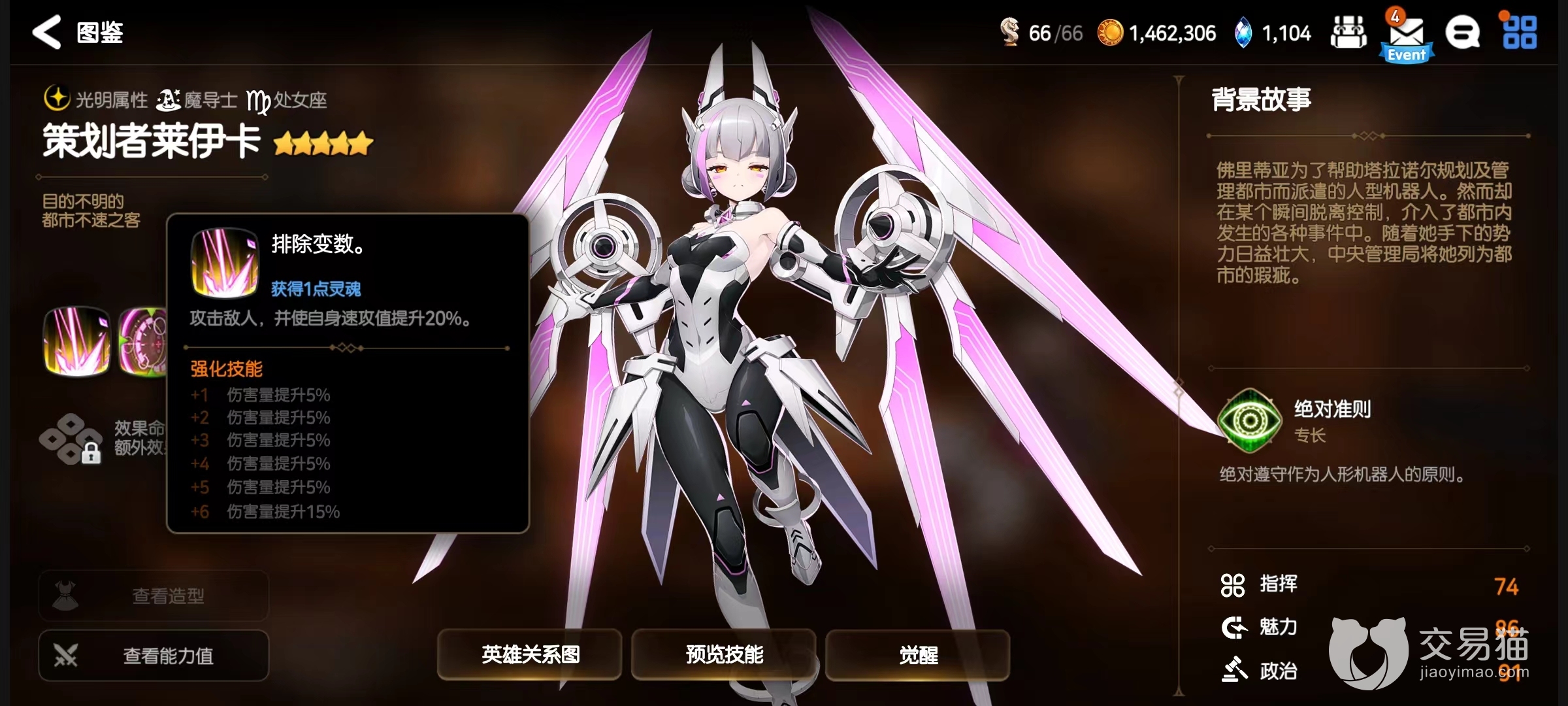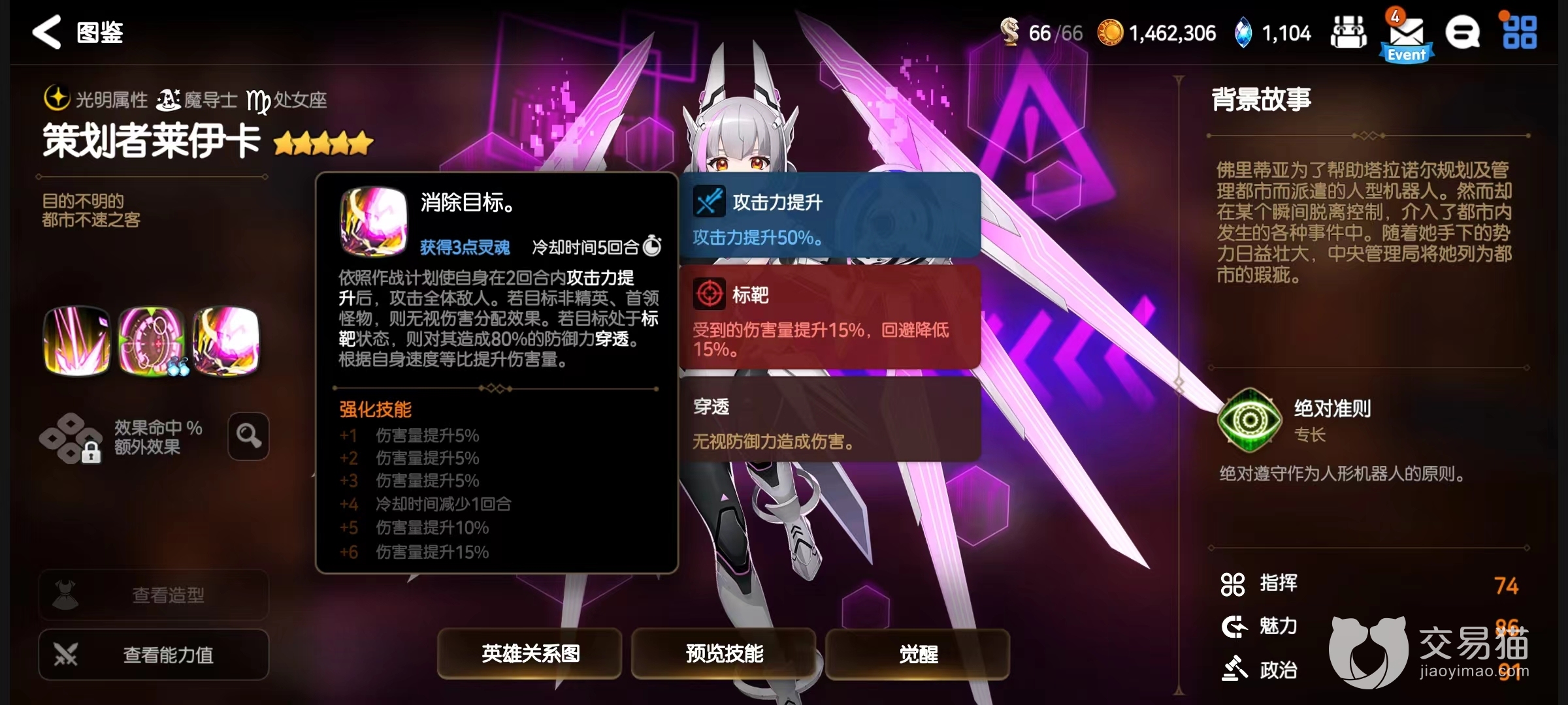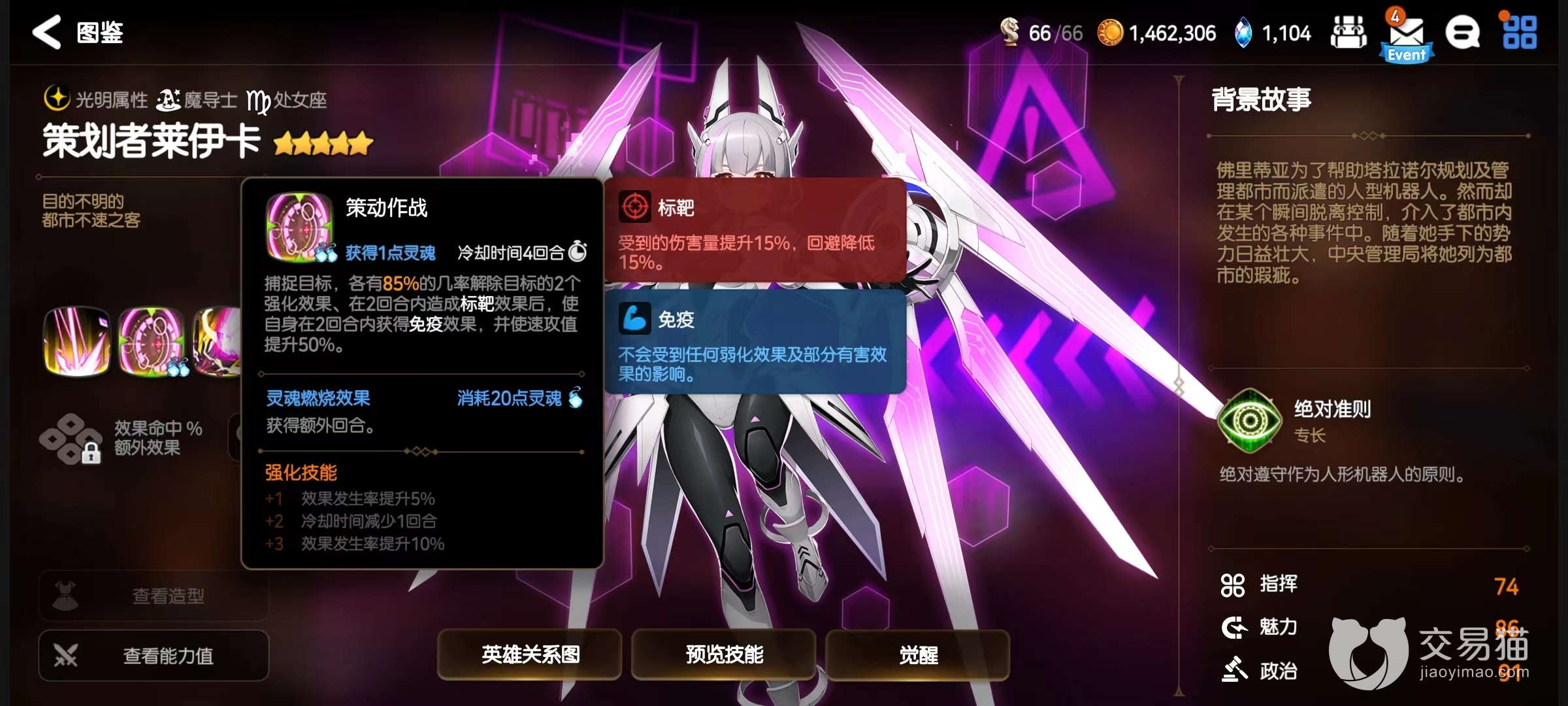 第1个技能排除变数,攻击敌人时,自身能获得一点灵魂,并且速攻值提升20%,比较常规的普攻技能,虽然附加有攻速值提升效果,但是没有其他影响。技能升级后也只能提高伤害量。第2个技能策动作战,这一技能效果就丰富了很多,能够捕捉目标,有很高几率解除目标身上两个强化效果,在两回合内造成标靶效果,使自身获得免疫,并且速攻值提升50%。