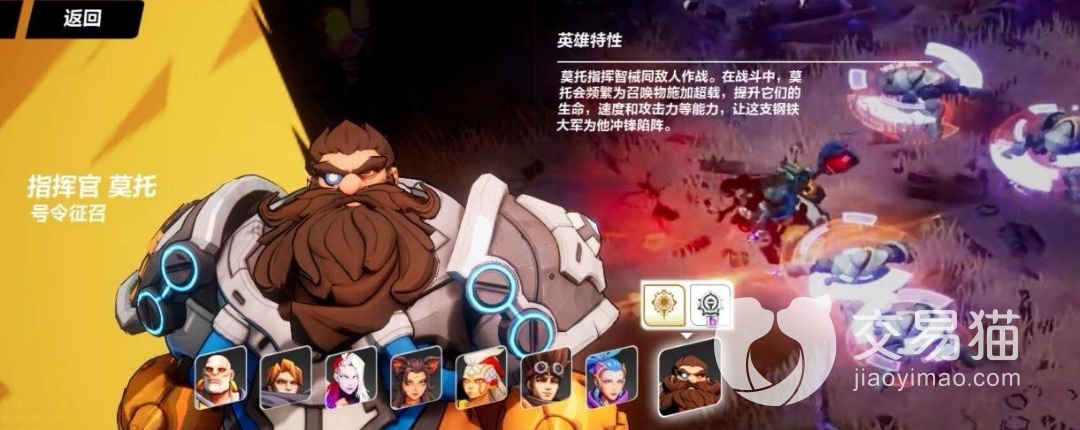 莫托拥有两个特性,分别是号令征召与冲锋征召,其中号令征召是一个免费特性,玩家在开局的时候就能直接使用,这个特性的强度是很大的,可以让莫托同时召唤出六个智械,此外,该特性能够让莫托在使用后,可以给召唤出的智能机械添加“超载”的buff,让这群机械士兵变得更加厉害。