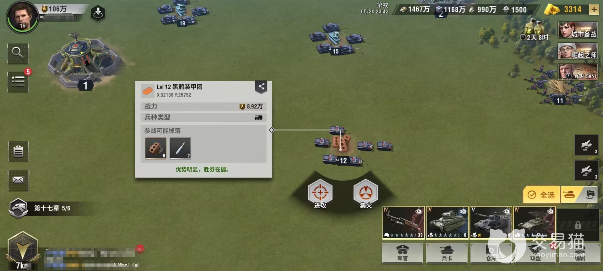另外大家如果攻打营地比较吃力的话,可以通过攻打自己基地周围的军团或装甲旅,这些只有几个小兵或坦克,大约不到一分钟的时间,就可以将他们逐一攻破。尤其要注意看看自己是否需要,最后获得的物资,如果不需要的话,消耗10个行动点是不值得的。如果战力低那么在战斗的时候一定要保住自己的火力强大的部队,比如喀秋莎部队,这个非常脆,被对方集火基本上就是被秒,可以将防御低的放在后排。