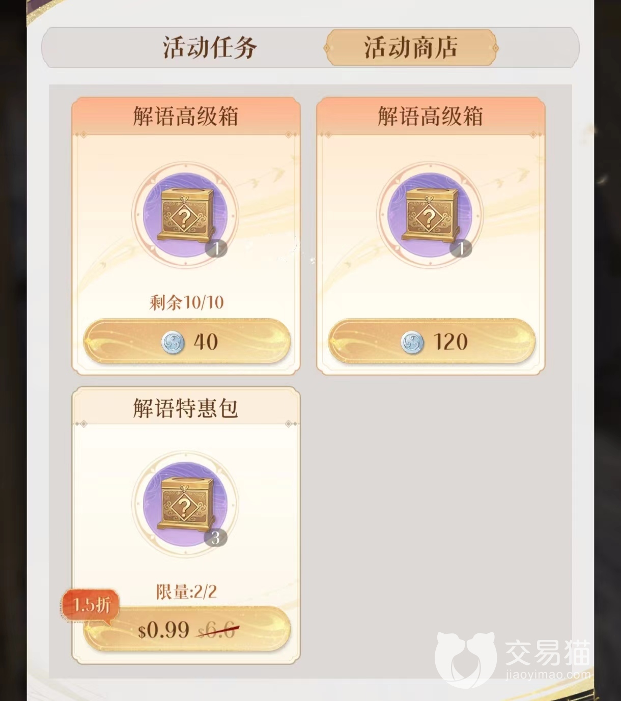 其次就是完成一些银币活动,银币活动也就是指需要花费银币的活动,这个类活动分为两种,一种是在游戏内消费300银币可以获得高级的解语箱子,可以开出来大约40个解语,玩家可以去购买限定的抽卡道具来将资源最大化。