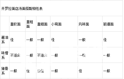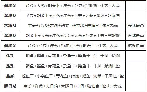好了,根据以上表格,开罗拉面店汤料的配方小编已经分享给各位玩家小伙伴了,在这里小编还要提醒各位玩家小伙伴们的是,玩家们要知道一个好的汤料就必须配好的面条。所以在游戏中面条的制作也同样很重要,玩家们要非常注重汤底与面条的搭配,如果搭配的不合适不仅不会给制作好的面条加分反而还会给制作好的面条减分。在游戏中搭配的相性有四种等级:不合适,一般,佳,极佳。其中极佳等级会大幅度提升面条的分数,而且还可以在试吃阶段为面条得到非常非常高的评价。所以玩家朋友们在制作汤料的时候一定要注意,汤料和面条的搭配等级尽量往“佳”等级和“极佳”等级靠近。