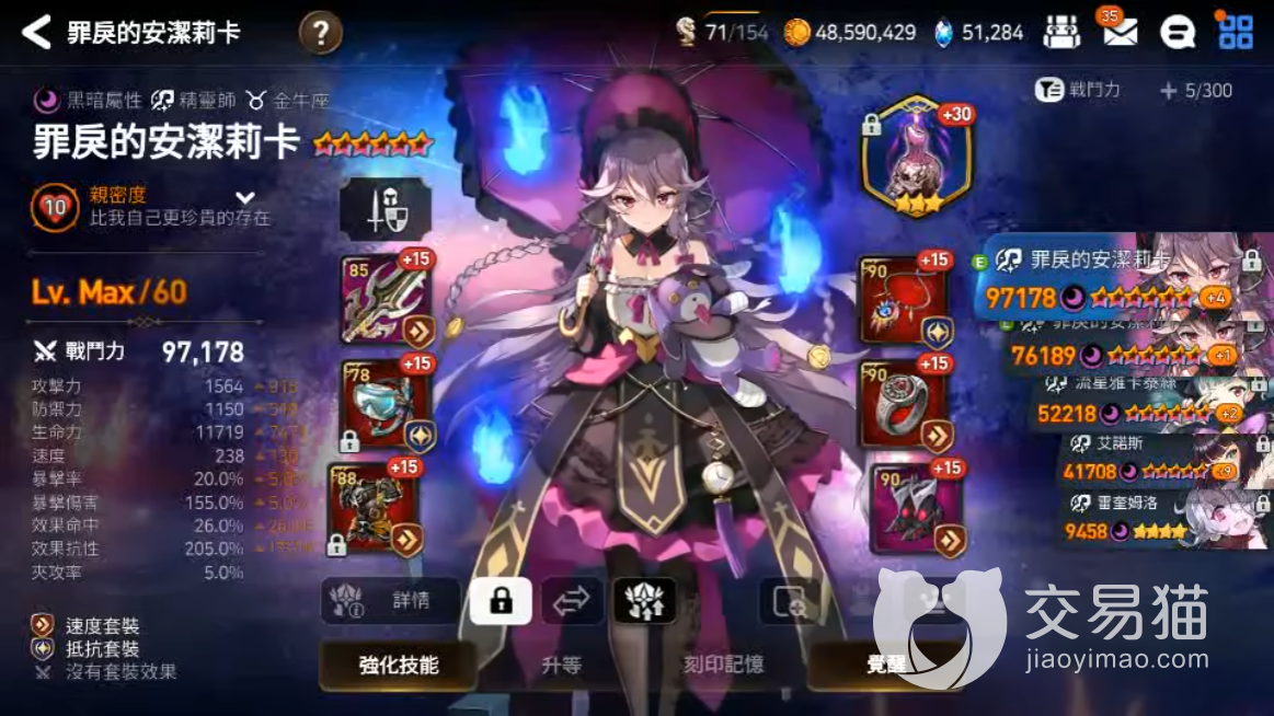 1、罪戾的安洁莉卡:带速度套和抵抗套,神器选择烛台。攻击力无要求、防御力无要求、生命值1W+、速度230+、效果抗性200%左右。