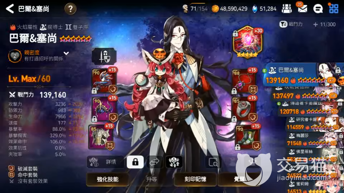 3、巴尔&塞尚:带速度套和生命值套,攻击力3000+、防御力无要求、生命值无要求、速度170左右、暴击伤害300%+、效果命中100%+。