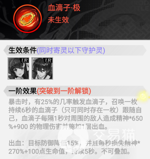 羁绊效果:生效血滴子·极。暴击时,有25%的几率触发血滴子,召唤一枚持续6秒的血滴子(只可同时存在一枚) 跟随自己,血滴子每隔1秒对周围的敌人造成精神*650%+900的物理伤害并施加1层出血。出血:目标防御降低15%,并且每秒损失精神*270%+100点生命值,持续5秒。这两个角色都是游戏里面数一数二的输出角色,两者合作的技能伤害提升一半以上,很适合想打速战速决的玩家,绝对是竞技场上热门羁绊。