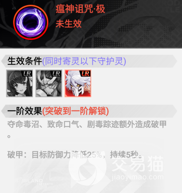羁绊效果:瘟神诅咒·极。夺命毒沼、致命口气、剧毒踪迹额外造成破甲。破甲:目标防御力降低25%,持续5秒。