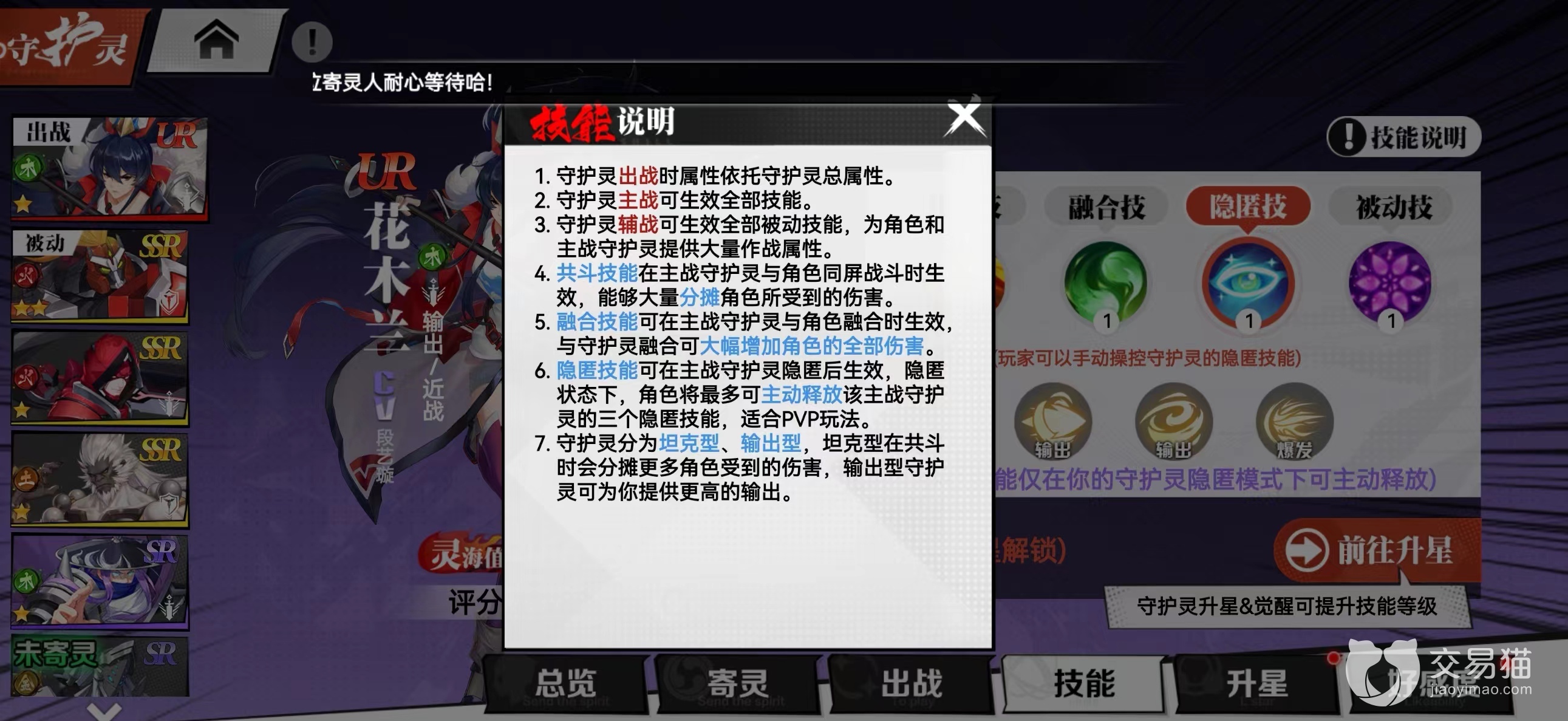 想要在游戏中越级过本,低战力就想挑战boss,技能的手法极为重要,守护灵的4类技能都需要利用好,共斗技(守护灵上场作战)、融合技(和主角合为一体增加额外属性)、隐匿技(可手动操作守护灵技能)、被动技能(只有出战位或被动位守护灵可生效)。
