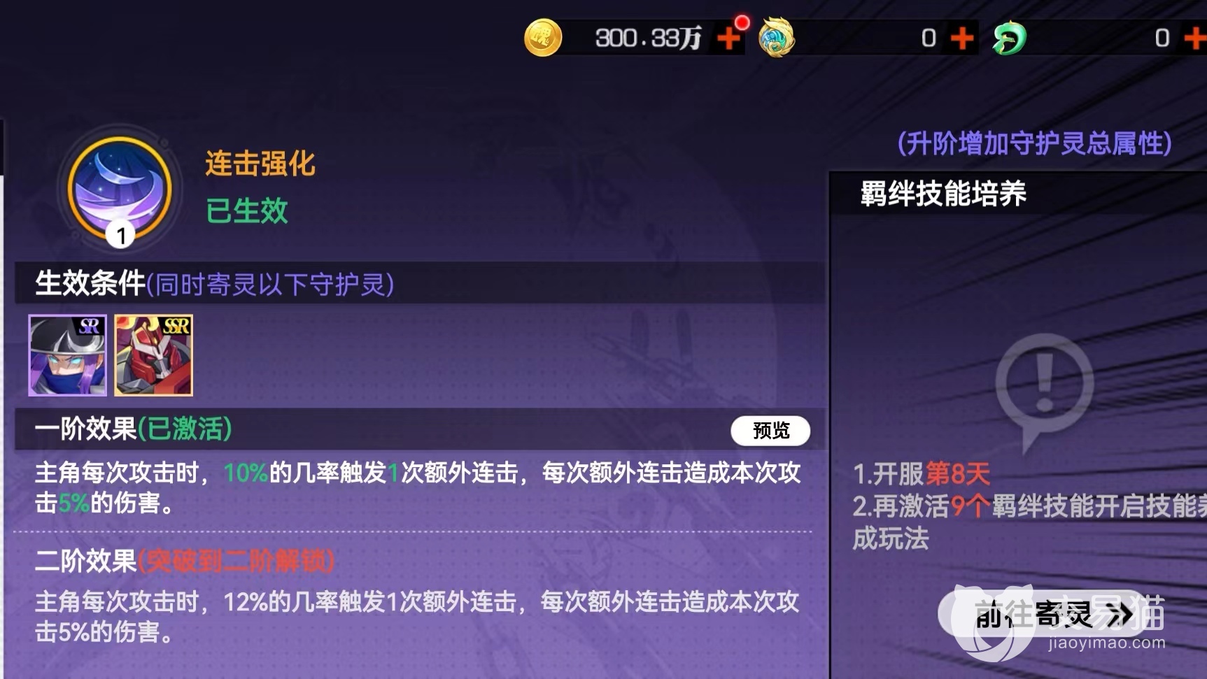 1.连击强化,需要同时寄灵于禁才可生效,在战斗中主角攻击时有概况触发1次额外连击效果,连击伤害会相对较低。