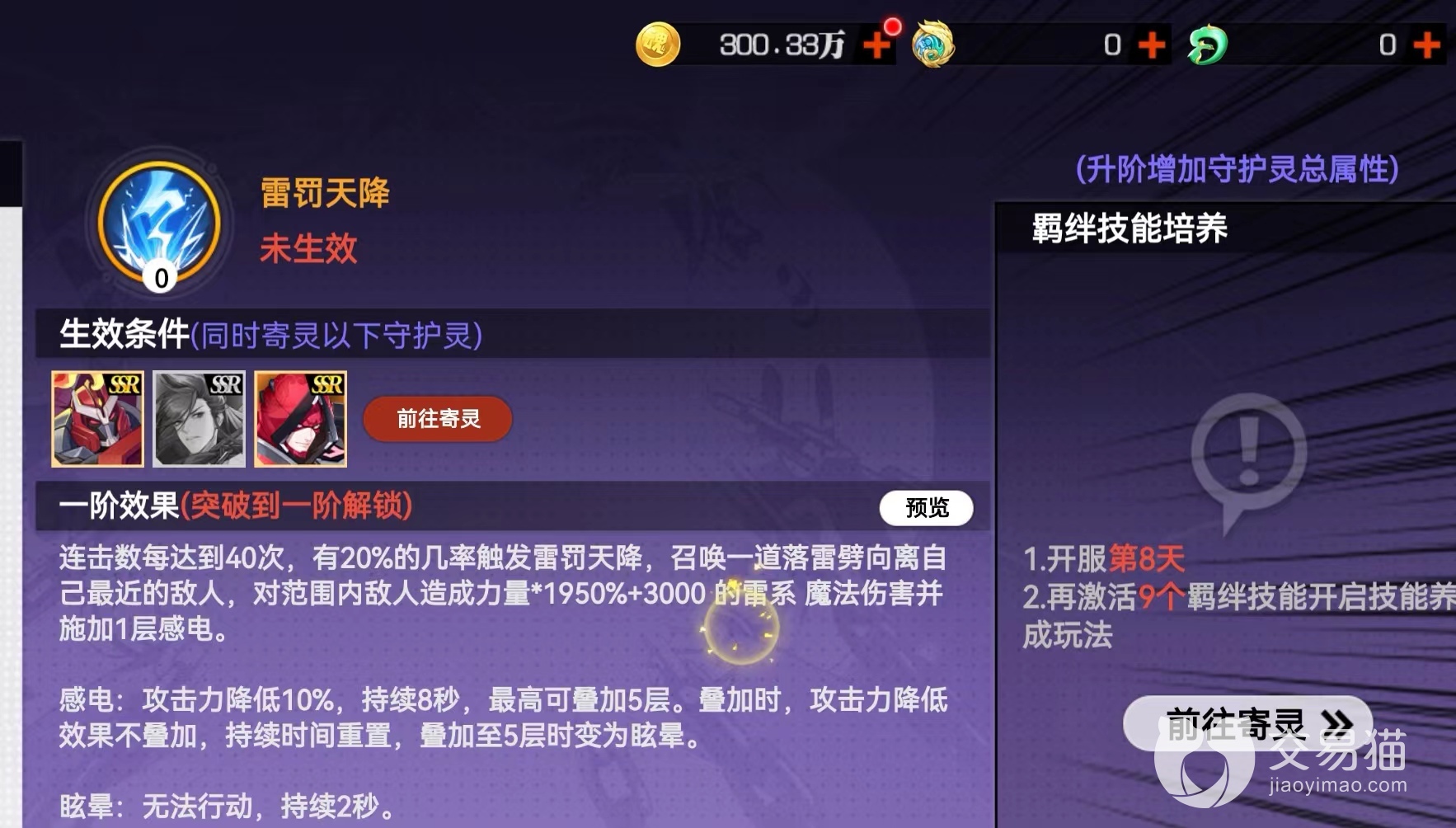 4.雷罚天降,需要指定的3个守护灵才可激活,效果和电磁脉冲一样,但是3个角色都是SSR稀有度的,比起马超更容易获得。