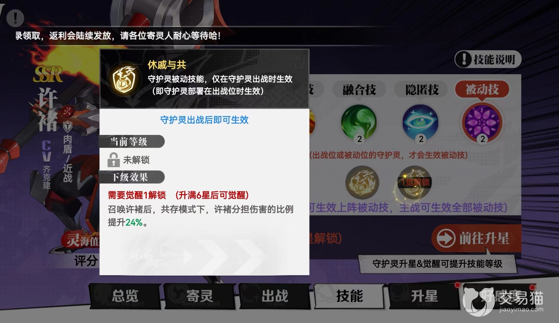 1.共斗技:被动上场时分担主公收到伤害的33%,召唤上场时造成范围性伤害,后续对敌人持续发动普攻造成物理伤害。