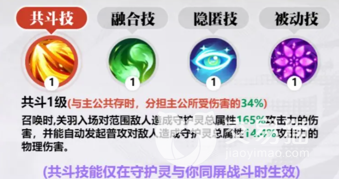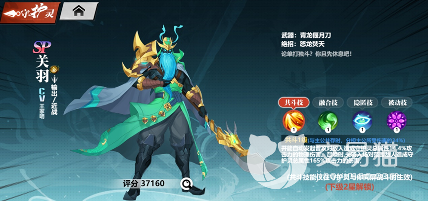 关羽在游戏中作为一个金属性SP级别的守护灵,在和主公战斗的时候可以分担高达34%的伤害,并且在召唤关于的时候还可以造成范围伤害,并且能够自动的发起普攻进一步产生物理属性的伤害,但是共斗技能只会在于主公同屏时才能够生效。