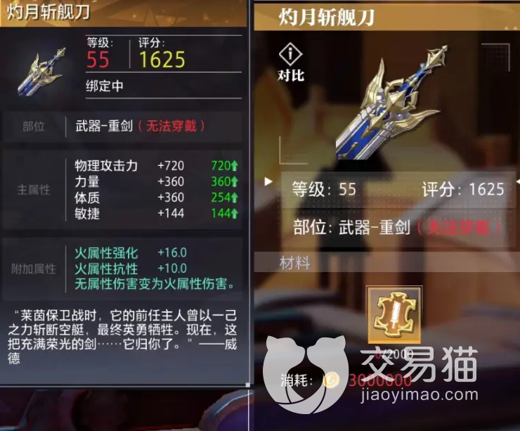 灼月斩舰刀:它是最适合狂战的一个武器,是一把非常好用的重剑,当大家把它等级提升到55级的时候,评分可以达到1625,主要增加的是角色的物理攻击。