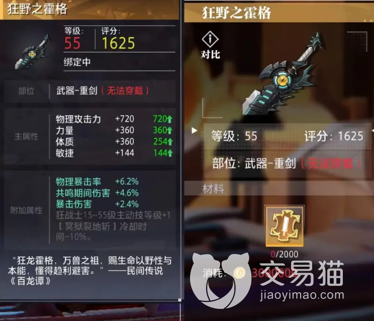 狂野之霍格:它的主打色是黑色和绿色,而且它的刀柄上还有一只黄色的眼睛,看起来非常怪异,但它的强度也很高,与上一个武器一样,同样是一把重剑。但它主要增加的是角色物理暴击方面的伤害,能够直接将物理暴击率提高6.2%,而且他的暴击伤害还能提高2.4%,只要在共鸣期间的话,它的伤害还能提高4.6%。