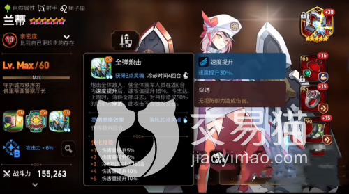 技能三:这是一个主动技能,也就是大招。这个技能可以攻击敌方全体,并给全队提供两回合的速度buff(增加30%速度),同时还可以给全队拉条15%,让全队更快地行动。这个技能不会触发敌方的反击效果,所以不用担心被雷姆等角色反伤。如果在释放这个技能时消耗了100点斗志,则还可以额外造成50%的防御穿透效果,增加伤害量。如果在战斗开始时斗志已经满了,则这个技能的冷却时间会清零,也就是说可以连续释放两次大招。如果敌方的buff超过10个,则还可以无限释放大招,因为每次释放后都会满足重置冷却时间的条件。