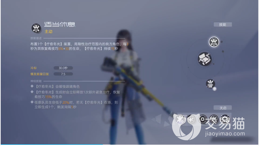 首先来看她的主动技能,主动技能是一个治愈性技能,在该技能开启时,角色会布置一个装置,在范围内所有的我方角色都会恢复6%+310的生命,该技能的持续时间为15秒。该主动技能会随着角色的等级升级而升级,并且在生成,使能够释放一次额外的紧急治疗,恢复决胜15%的生命。就是说全体队员的生命都低于20%,是该自己的冷却时间还没有过,也会随机生成一个紧急治疗触发时间为5秒,是一个非常优秀的治疗被动技能。