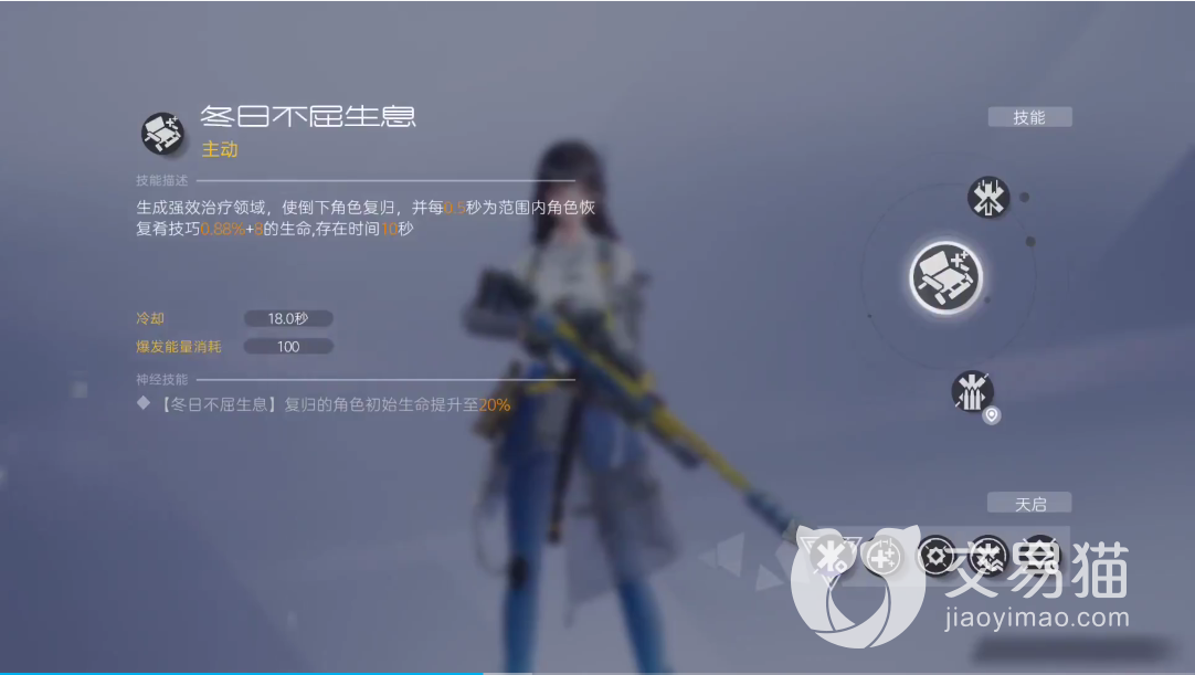 二技能冬日不屈的生息是最为强大的主动性治疗既能该技能能够生成强力的治疗领域,能让死亡的角色进行回归,并且该技能释放的同时,能为范围内所有的角色恢复0%点86+8的生命值存在时间为10秒,能持续的进行治疗,其实最后可以把这个技能当做一个复活甲来使用。
