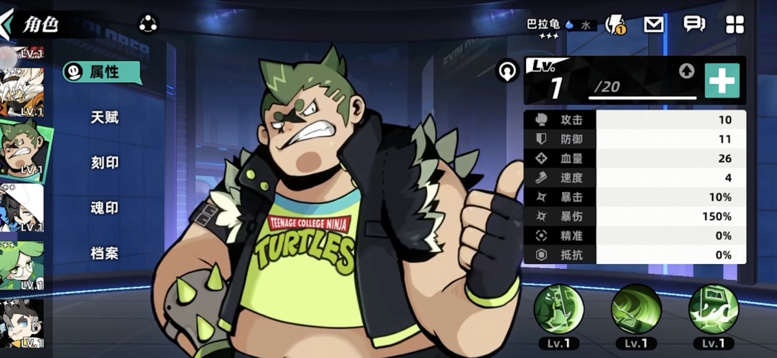 巴拉鬼的技能主要有三个。第一个技能是盾击,可以全概率对敌人的单一目标施加嘲讽,这个能力也可以帮助队友吸收伤害。这个概率会随着后期等级的增加而增加。第二个技能是飞盾回旋,可以帮助队友提高防御状态,随着等级的提升,技能的持续时间和攻击力也会慢慢增加。第三个技能是狂浪一击,使用后我们有85%几率眩晕敌人,持续2回合,还能造成160点的威力。如果之后能升级到满级的话,眩晕的时间也会变长。