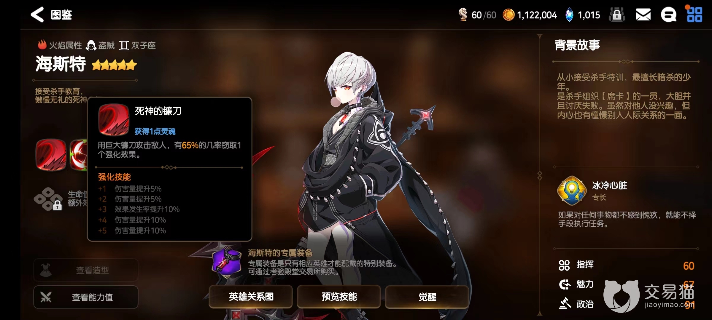 技能:“死神的镰刀”可以造成单体伤害,并有65%几率偷取敌人一个强化效果,该技能是常规技能,没有冷却,使用时还可获得一点灵魂,并且它的效果非常有意思,是偷取而非复制敌人的强化,这就意味着,在自身获得和敌人相同强化效果的同时,敌人身上的那种效果也会消失,此消彼长之下,这个强化的幅度可谓是变相得到了增加,唯一美中不足可能是其伤害只能吃到攻击加成,而无法像其他主C那样额外吃到诸如防御,速度这类自身的优势属性。