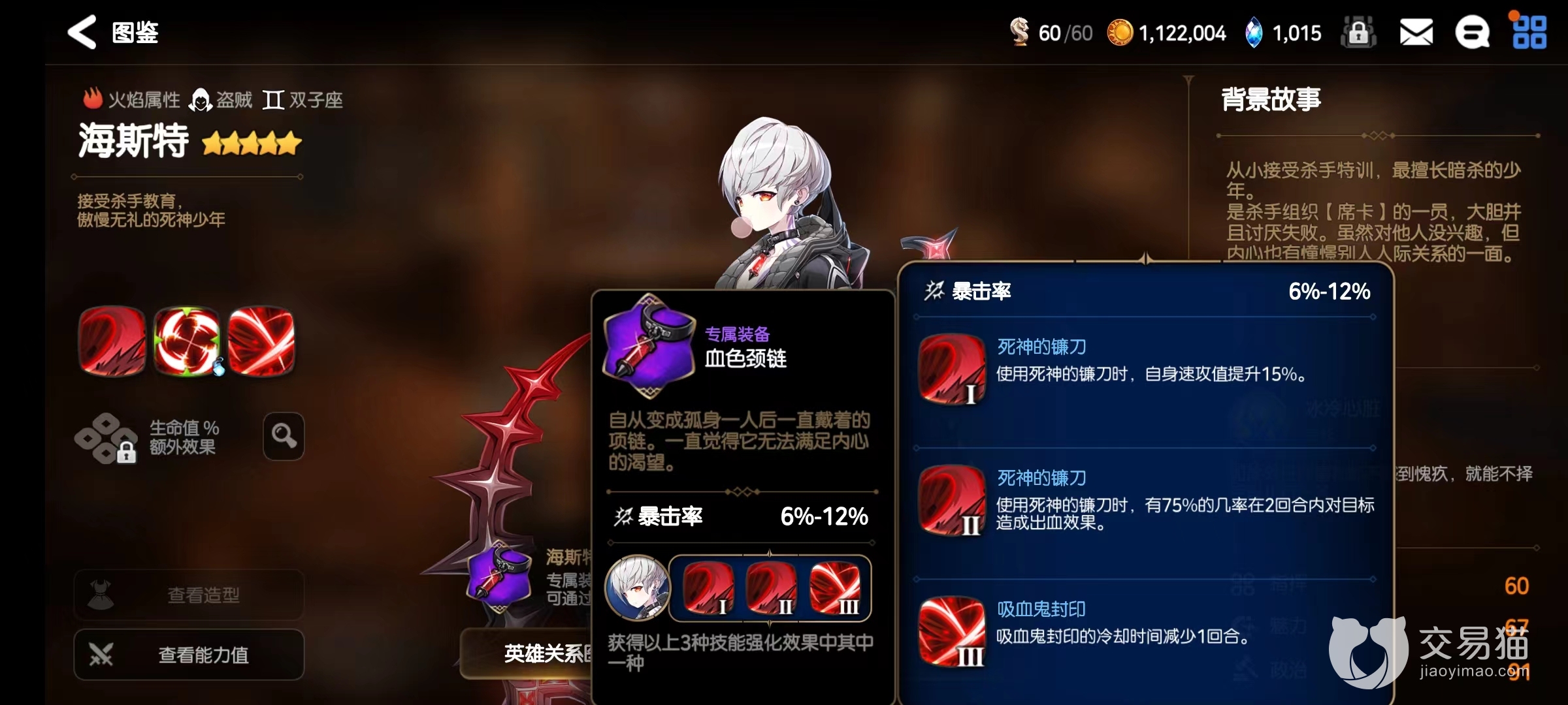 神器:“血色项链”是海斯特的专属装备,拥有紫色品质,提供6~12%的暴击率属性,另外对“死神的镰刀”和“吸血鬼封印”都有相应的加持,前者在该装备一阶和二阶时分别获得“速攻值+15%”和“75%几率附加两回合流血”的额外效果,后者则提供“降低一回合冷却时间”的效果,这些效果都切实提升了海斯特在进攻端的表现。