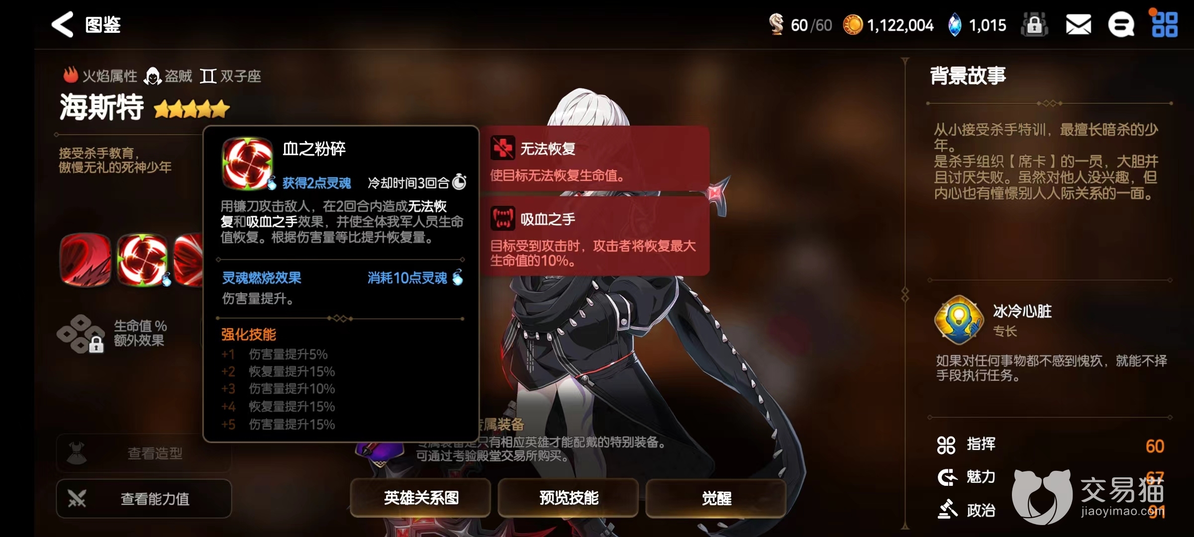 “吸血鬼封印”则是海斯特的大招,冷却时间长达六回合,使用时可获得3点灵魂,其具体效果是对全体敌人造成伤害并驱散他们身上两种增益,之后还有85%的几率附加两个两回合的流血效果。如果伤害产生暴击,更是有70%几率直接降低敌人们两回合的防御。值得一提的是,这一技能会在敌人处于3人以下时提供额外增伤,敌人数量宇少,则伤害越高。另外该技能也无法受到反击,所以对付各种敌人均能展现不错的收益。