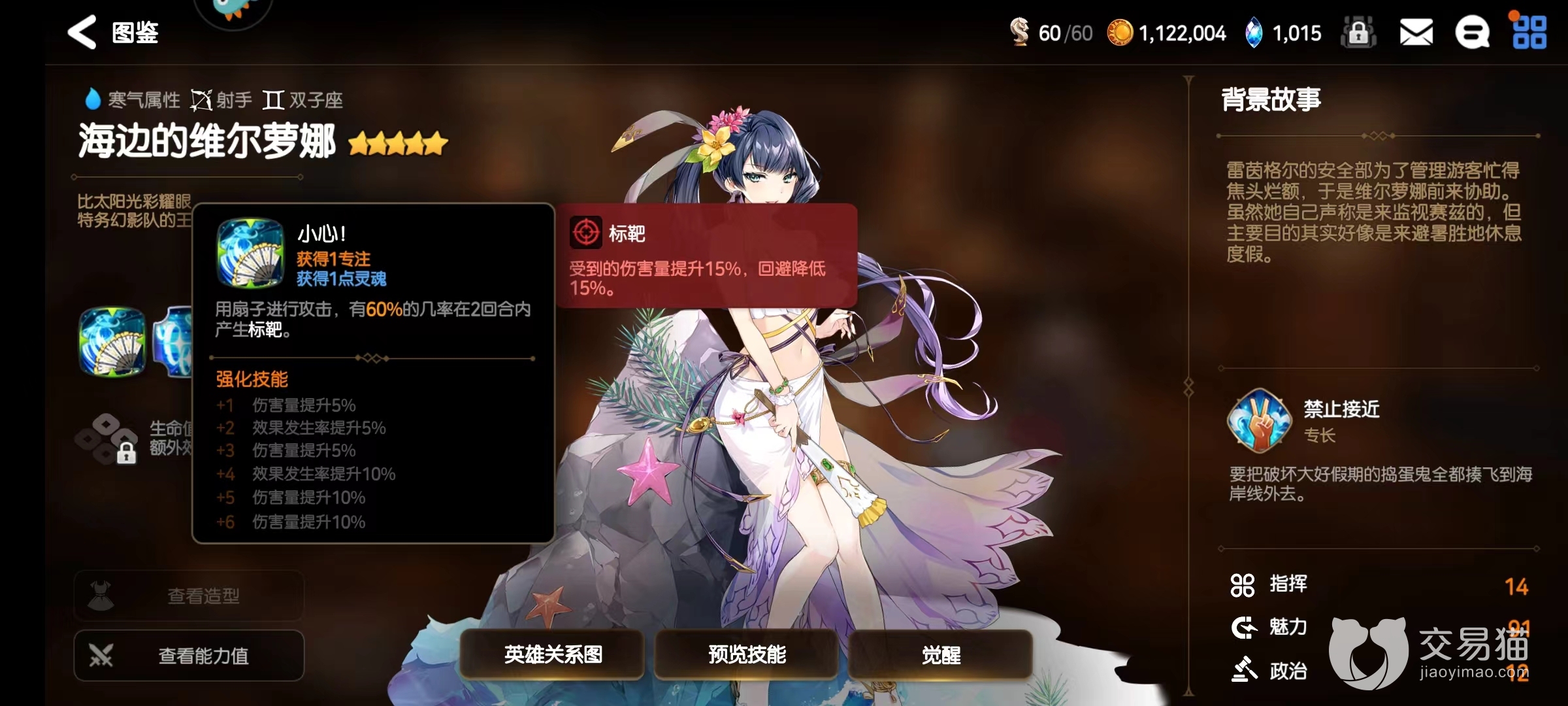 技能:首先是作为常规技能的“小心!”,使用后除了获得常规的一点灵魂,亦可得到一点专注,后续攻击敌人时能够更稳定的去命中,其本身的效果则是造成一次单体伤害,并有60%几率附加标靶效果,这一效果会令敌人所受伤害提高15%,回避率降低15%,两个效果一个提升了维尔萝娜的伤害上限,一个则确保了输出的稳定性。