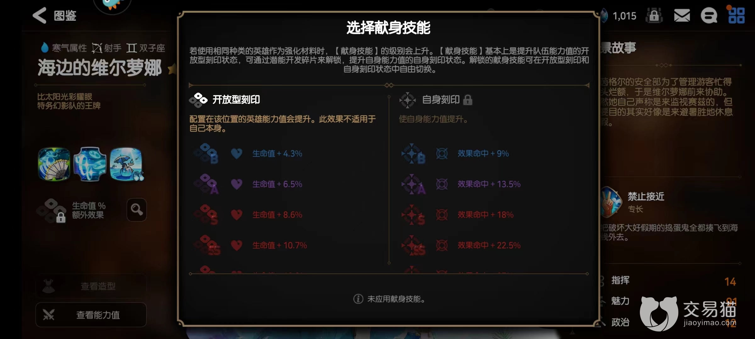 刻印:维尔萝娜有两种刻印,第一种是对全体队友生效的开放型刻印,它可以按百分比提升友军的生命值,通过升级,这个提升的比例也将不断增加,考虑到维尔萝娜二技能会将自身所受伤害分摊给队友,所以这一技能等于变相的增加了队友的坦度,从而使他们在被分摊伤害时能够撑得更久。第二种则是只对自己生效的自身刻印,激活之后能够增加自己的效果命中属性,这一属性提升之后,技能中提供的那些减益都将更稳定的对敌人生效。
