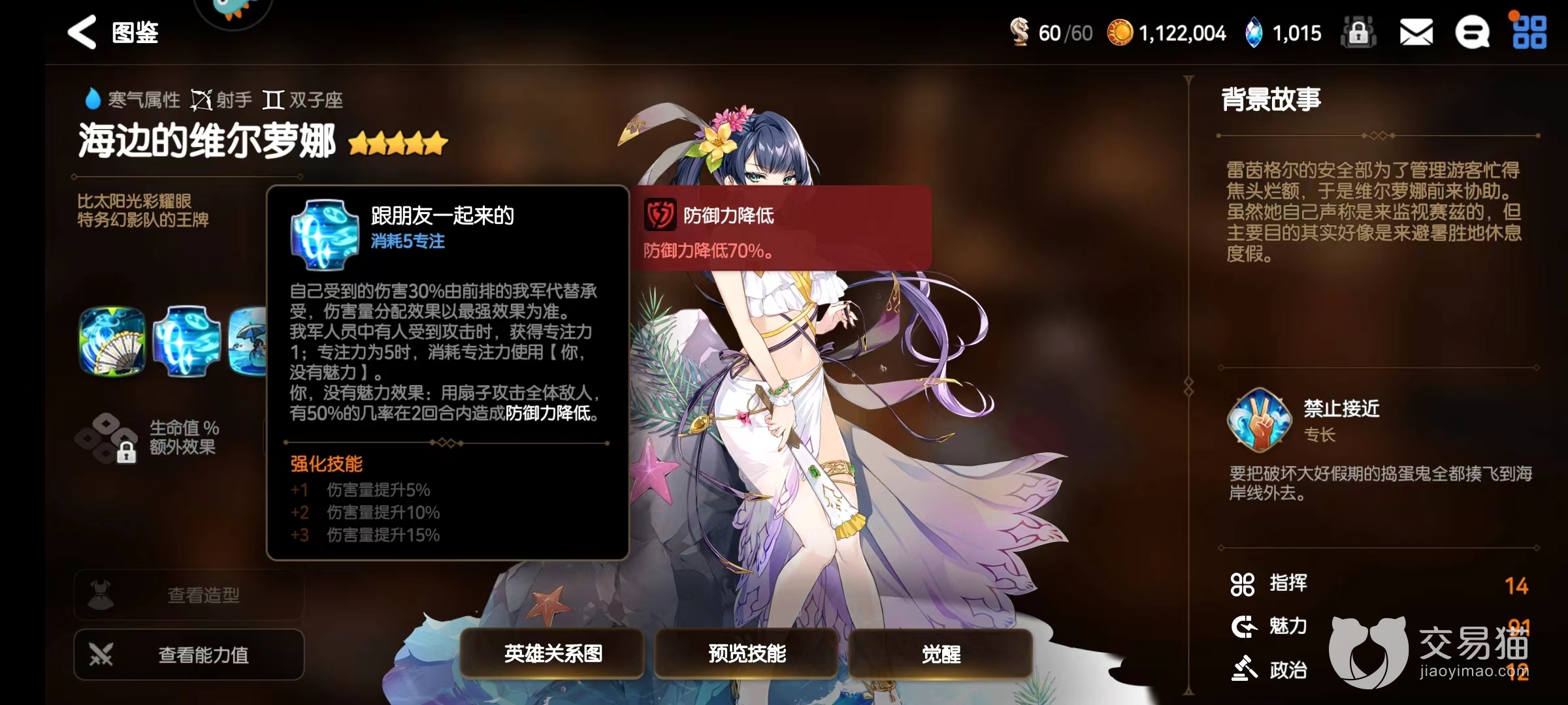 二技能“跟朋友一起来的”需要消耗五点专注方可使用,使用后可以令自己所受伤害的30%转移到前排友军身上,这一效果令维尔萝娜的生存环境明显变好,输出的时候也能更加没有后顾之忧,另外它还有一个被动效果,那就是会在友军受到伤害时给维尔萝娜提供一点专注,满五层专注时会消耗它对敌人造成一次全体伤害,并有50%几率降低敌人们2回合的防御力。该技能无论是主动还是被动都具有十分实用的效果,主动提供的伤害分摊保障了维尔萝娜的生存,被动则补充了她的输出。