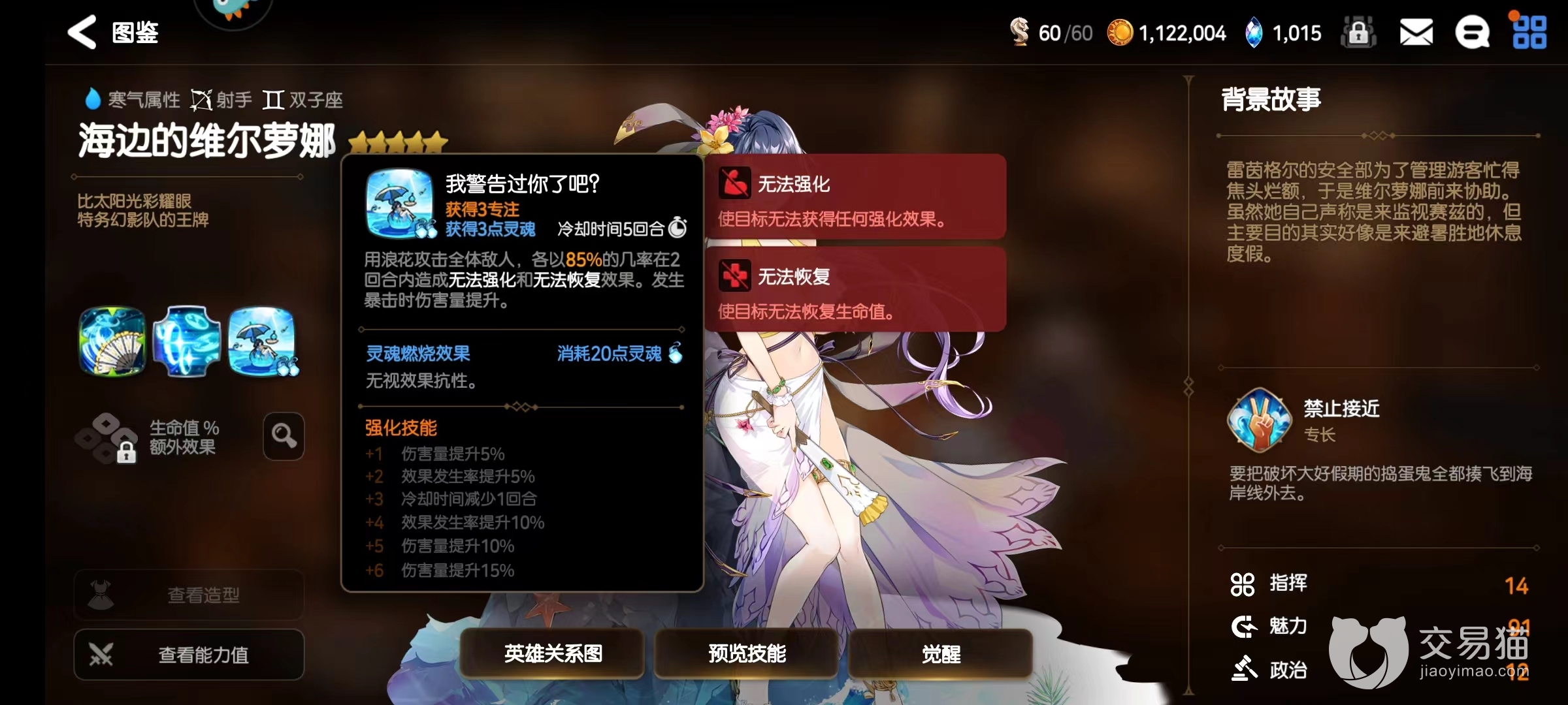 大招“我警告过你了吧?”冷却时间为5回合,使用后会获得3点专注和灵魂,其效果是攻击全体敌人,并有一定几率附加无法强化和无法恢复的效果,此外,该技能还可以在发生暴击时额外提升伤害,值得一提的是技能在消耗灵魂后使用,还会获得无视效果抗性的强化,这一强化在效果触发时能够稳定保障它在敌人身上生效。另外技能本身的伤害和减益效果也对敌人的生存环境造成了显著的威胁。