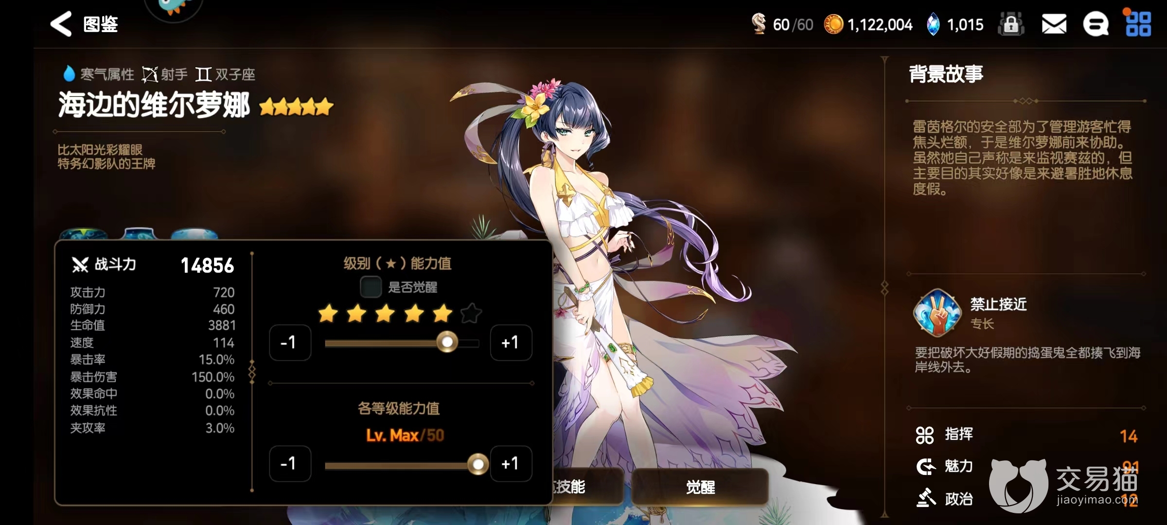 属性:首先攻击力有720,这已经是比较顶尖的水平,意味着她在输出层面有着无与伦比的强度,460的防御也还算看得过去,能够有效减少所受的伤害,3881的生命稍微少了一些,不过考虑到她射手的定位,一般都只会在后排偷输出,不会直接去硬抗对手的爆发,所以无伤大雅。然后速度方面有114,已经属于接近顶尖的水平,面对多数敌人时均有先手优势。整体来看,属性除了血量少些,其他方面都是比较不错的。