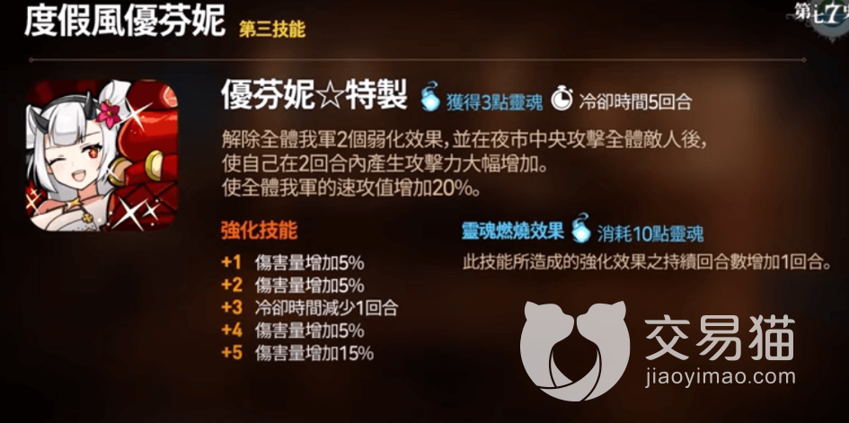 大招“优芬妮特制”可以解除全体友军2个弱化效果,并提供两回合的速攻值和攻击力加成,在这些加成之后,优芬妮还会对敌人造成一次全体伤害。该技能既能解弱化,又能加属性,而且还可以打一波AOE爆发,是一个非常强力的先手技能,并且只要燃烧灵魂就能够减少两回合CD,因此也无需担心可供使用频率太低。