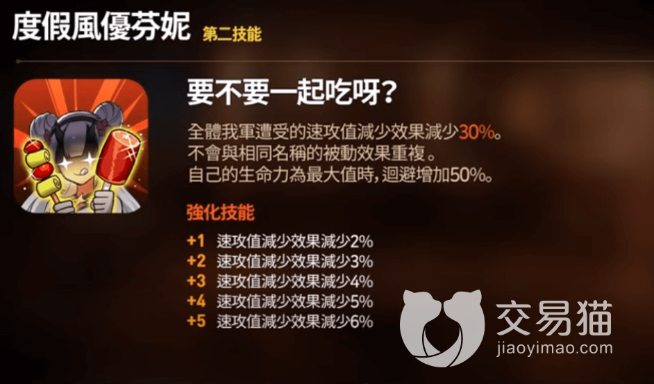 二技能“要不要一起吃呀”是一个被动技能,可以让全体友军在受到速攻值降低效果时,减免50%的影响,并且还会给自身提供35%的回避率,当自身处于满血状态时,这个回避率的加成从35%提升至70%。该技能的闪避是最大的亮点,它让优芬妮在满血状态下能够获得近乎无敌的效果,不过弱点也是有的,那就是容易被非攻击的驱散和控制克制。