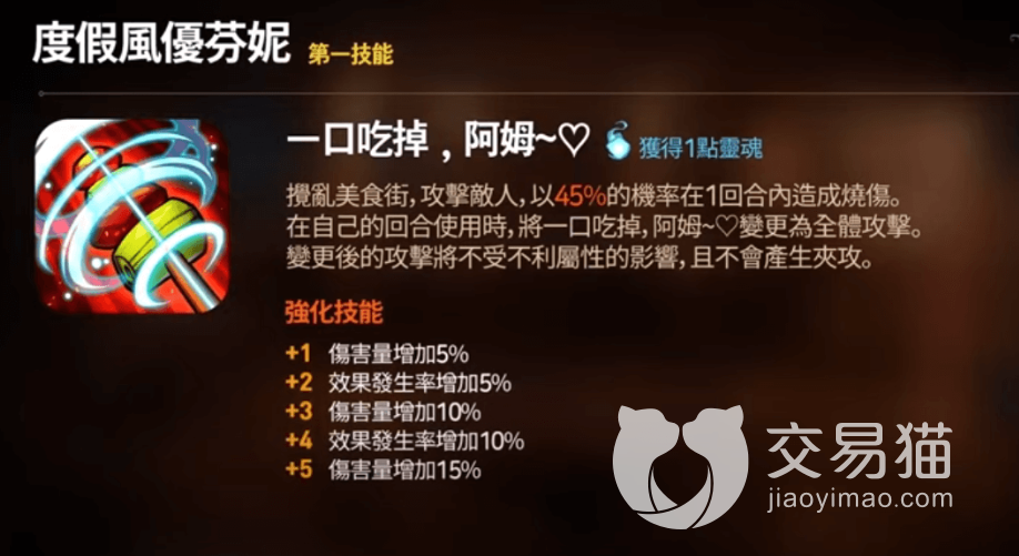 技能:一技能“一口吃掉,阿姆”光从面板来看是一个单体输出技能,基础伤害倍率有80%,但却有75%的几率对敌人附加烧伤效果。另外如果此技能是在自己的回合内施放,那么它的伤害范围会从单体变为群体,并且不会因为属性被克制而削减伤害,当然,它也因此无法再触发夹击。这个技能作为常规输出技能,基础倍率并不算特别拔尖,不过考虑到它每级都有30%的倍率增长,因此培养满之后还是能够打出不俗输出的。