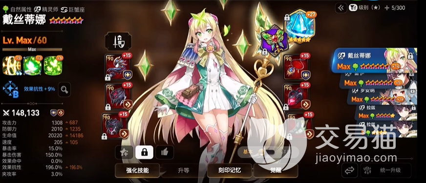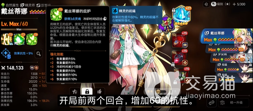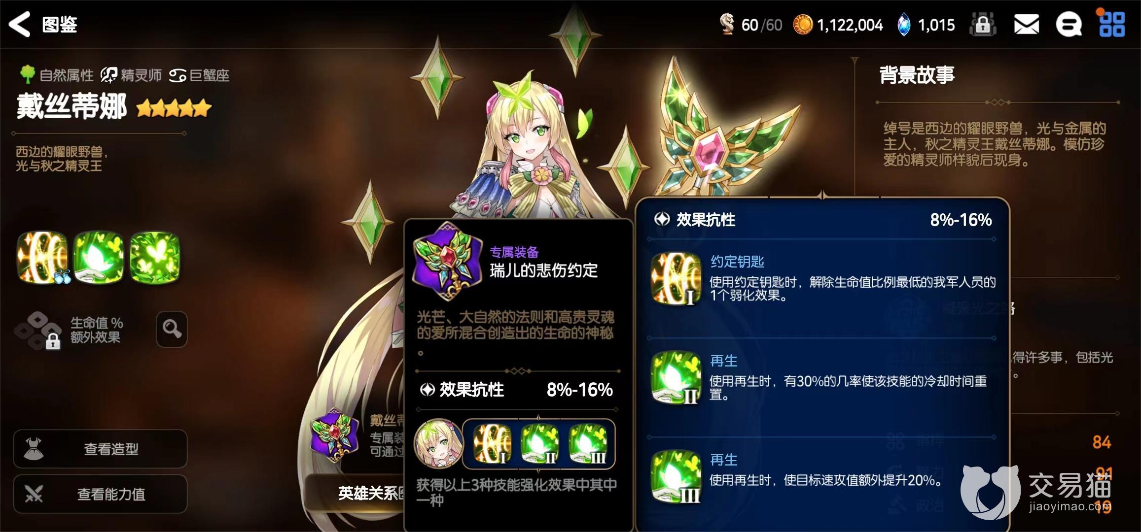 最后戴丝蒂娜还有一个专属装备名为“瑞儿的悲伤约定”,这一装备可以为其提供8~16%的效果抗性,这个抗性可以与大招提供开局抗性叠加,如此一来,敌人将会难以对其造成控制和减益效果,对于一个很吃属性的奶妈角色来说,这也算一个极大的加强。另外装备通过升阶还能够强化她的两个技能,其中一阶强化会令“约定钥匙”在治疗残血队友时额外帮助他解除一层弱化,从保护性上来说更进一步,二阶和三阶的时候则会让“再生”多出一定几率重置冷却时间和额外提升目标20%速攻值的效果,这两个效果一个提高了技能的使用频率,一个进一步加强了队友的先手能力,对实战的帮助都十分显著。