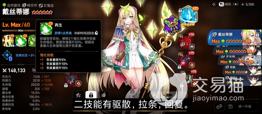 第二技能“再生”是冷却两回合的主动技能,使用后会解除单体友军两个的弱化效果并回复血量,同时也会提升其50%的速攻值,这一系列的效果能够保障你的主C始终状态在线,包括输出状态和血线的健康,另外这个速攻值还能够让队友获得先手优势,这样有利于他在后续出手时能够抢夺先机,早一步打爆发也能够防止因为自己的身板太脆而暴毙。
