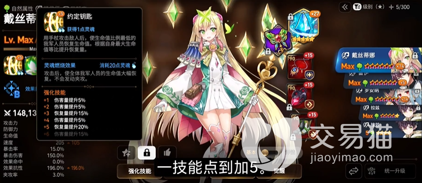 技能:第一技能“约定钥匙”使用后会攻击单体敌人,并为己方血量最少的友军回复生命值,该技能可以获得一点灵魂,不过也可以消耗灵魂来进行强化,强化之后,治疗的范围与治疗量都会得到显著提升,但伤害没有提升,而且不会触发夹击。总体来看,该技能更多还是偏向于治疗队友,伤害只能算是锦上添花,而且不管是升级技能,还是消耗灵魂强化技能,这个回复量都是会源源不断得到增强的,因此功能性堪称一绝。