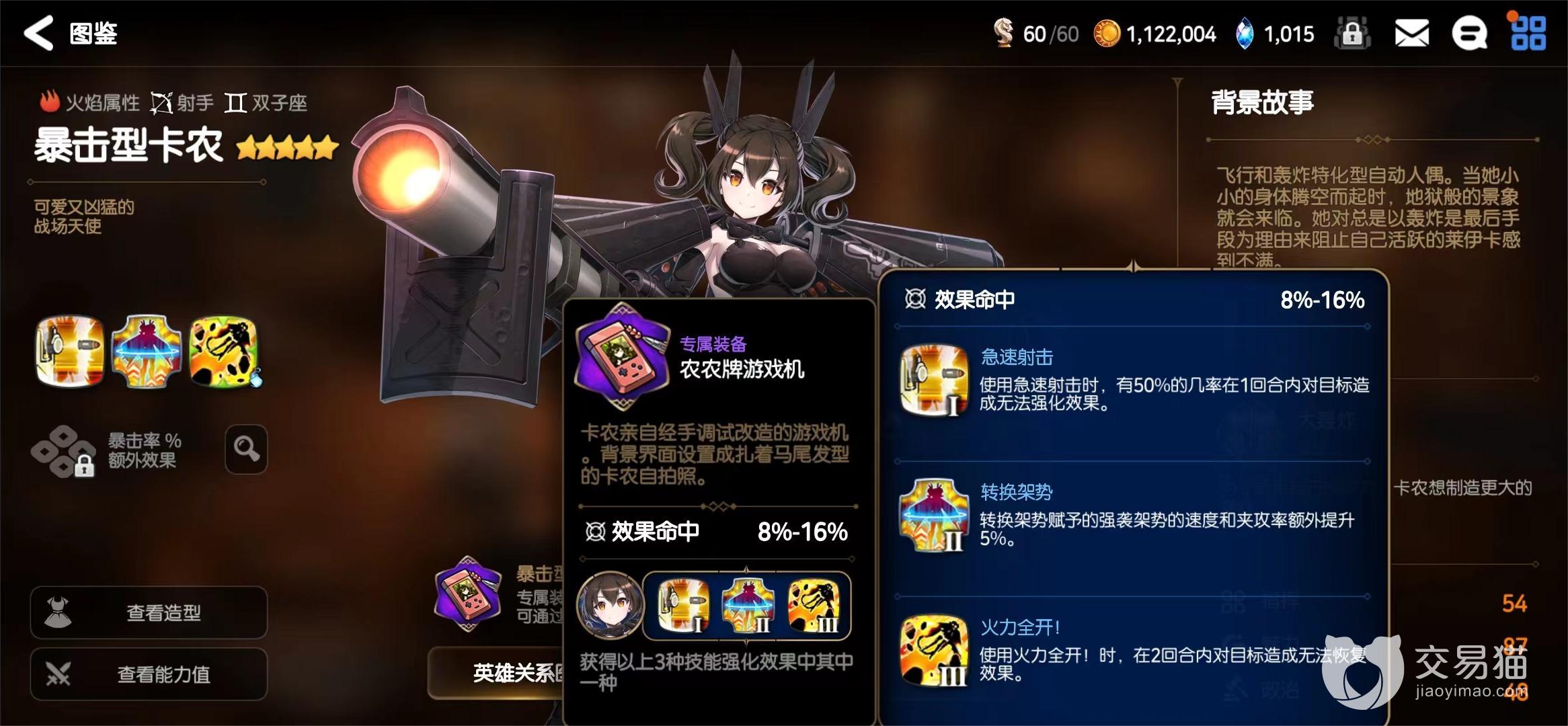 神装“农农牌游戏机”提供8~16%的效果命中,并且对三个技能各自提供一种强化,急速射击的强化是有50%几率对敌人施加一回合的无法强化效果,这就让敌人的属性始终被自己压制。转换架势的强化则是速度和夹攻率获得额外提升,己方的先手优势和集火能力都得到进一步加强。火力全开则是让敌人两回合无法恢复,这一效果给予了卡农应对奶妈队伍的能力。