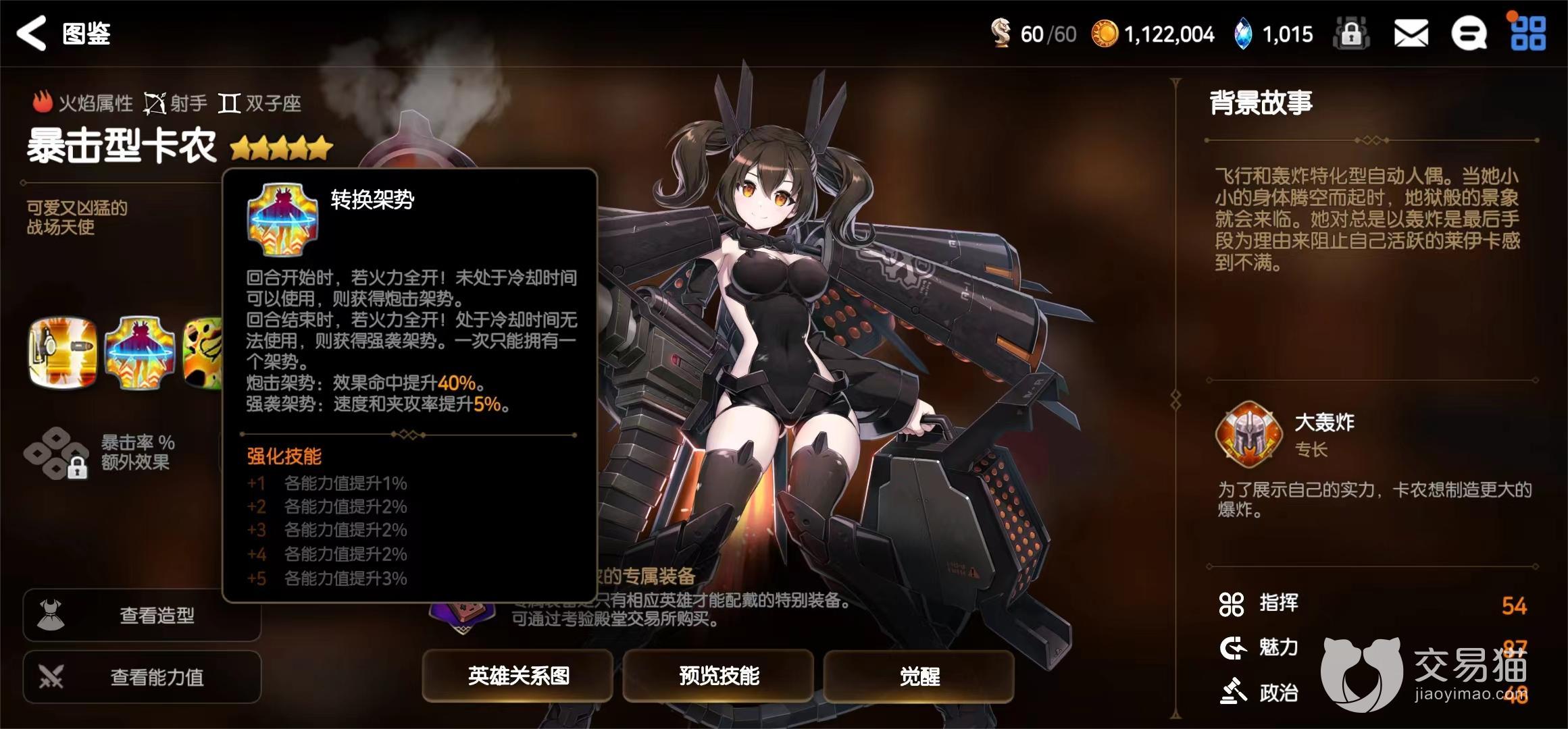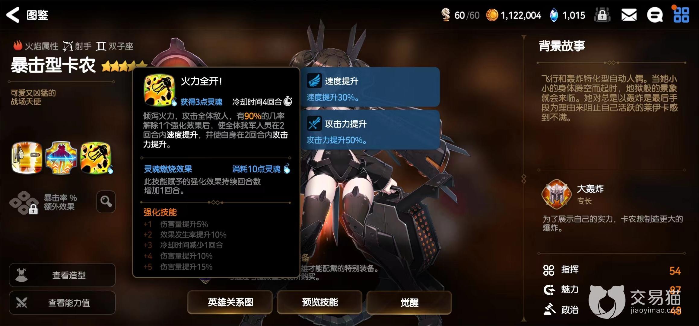 大招“火力全开”使用后攻击全体敌人,并有90%几率驱散敌人身上的一个强化效果,不过考虑到二技能的因素,实际上大部分情况它都是百分百触发的,而在这之后己方全员还会获得2回合的速度提升,而卡农自己额外再获得两回合的攻击提升,这一技能之后如果有残血没死,正好可以趁着速度和攻击都提升过的势头将敌人剿灭!因此该技能可以说让卡农同时兼具了功能性,群体爆发和持续伤害。
