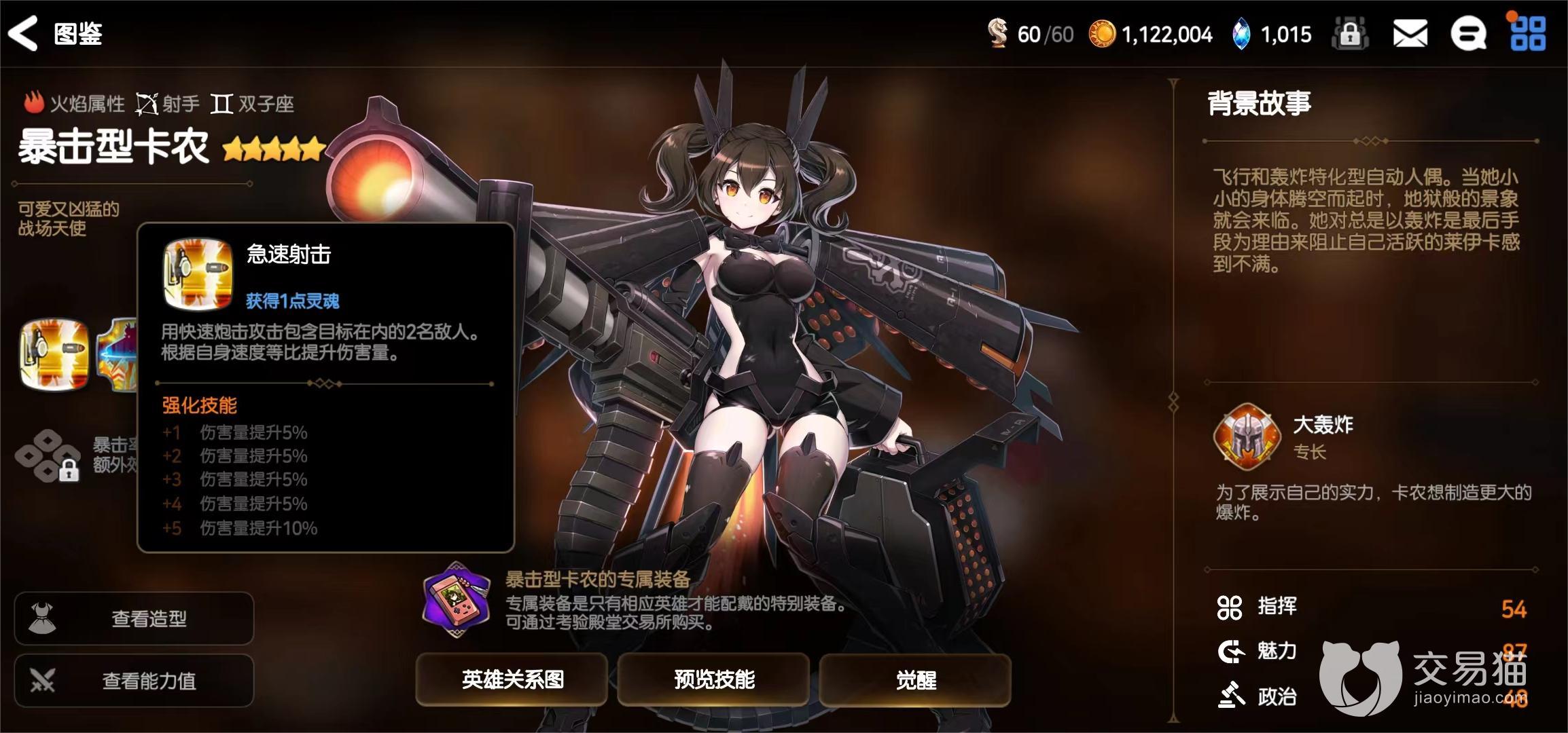 一技能“急速射击”使用后快速炮击两名敌人,这个炮击不仅能够吃到攻击力加成,还可以吃到速度加成,恰好这两项都是卡农的强项,另外该技能还可以令其获得一点灵魂,后续其他技能需要强化的时候也可以通过消耗灵魂的方式来进行。它作为常规输出技能,伤害能力还是非常出众的,主要在于能吃两种属性加成,并且每次升级技能都会增加额外伤害。