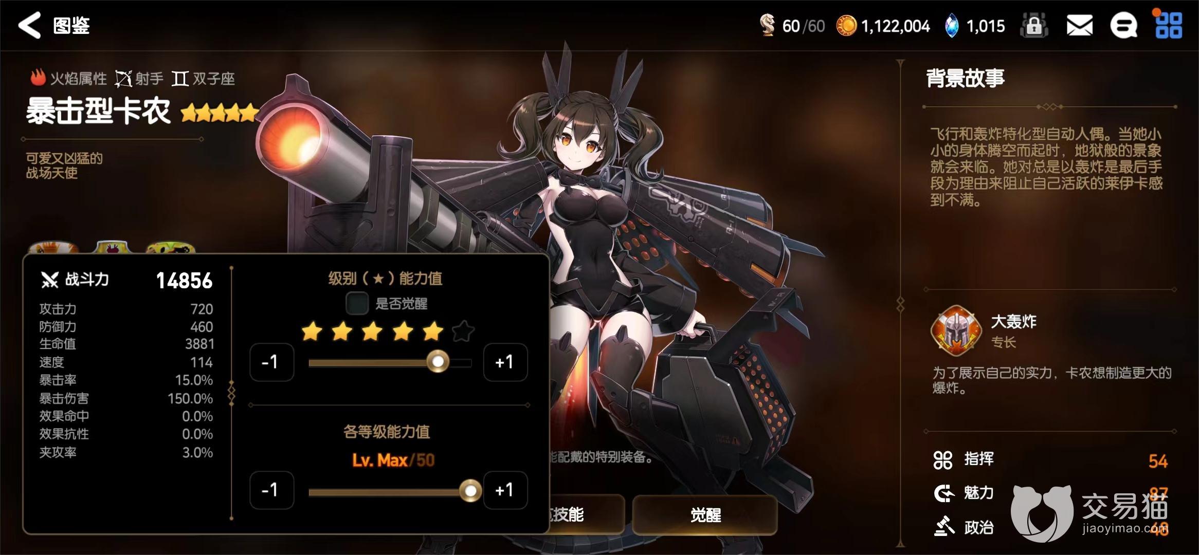 首先从属性来看,她有着720的基础攻击力,这个数值已经属于非常顶尖的水平,而作为一个射手角色来说,如此高的攻击能够让她在实战中发挥最大的输出作用,这样也不负其他队友对于她的保护,其防御力则有460,其实已经算得上中等水平,对比其他射手来说要稍微能抗一点,生命值不到四千着实少了一些,然后114的速度可以算的上一流。至于暴击那些她倒是没什么特别的,还是照例的15%+150%。