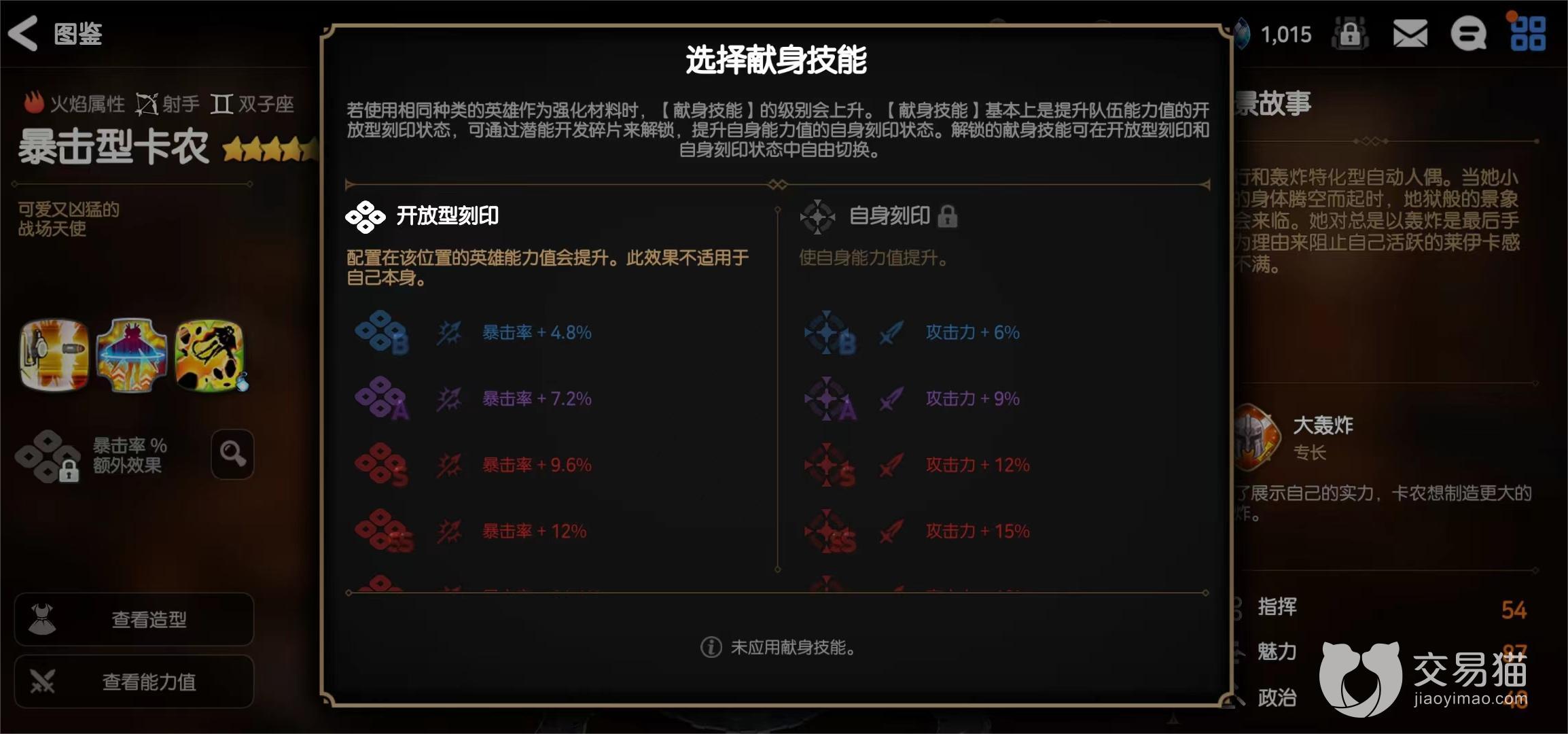 最后就是两种刻印,开放型的为队友提供了暴击率加成,这个对卡农自己最为受益,如果队伍中有其他和她一样的输出角色,这个加成也会起到不小的作用。自身刻印的话则是提供的百分比攻击力加成,这种一般是角色自身攻击越高,收益就越大的,恰好卡农就属于这种高攻击的角色,因此她的攻击数值又将进一步提升。
