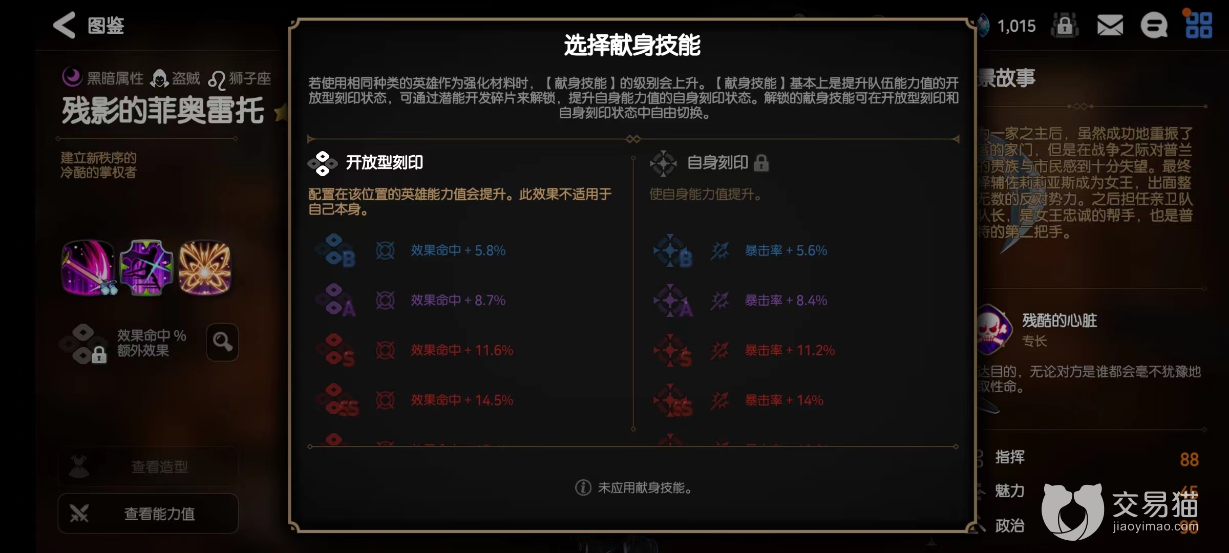 刻印:开放型刻印他提供的是效果命中,最多可达到17.4%,这个数值已经属于很高的水平,能够显著提升实战中的命中,而且因为它作用的是全体队友,所以无论是菲奥雷托自己的命中下降,还是其他队友的减益,都能够切实享受到这一效果的加成。
